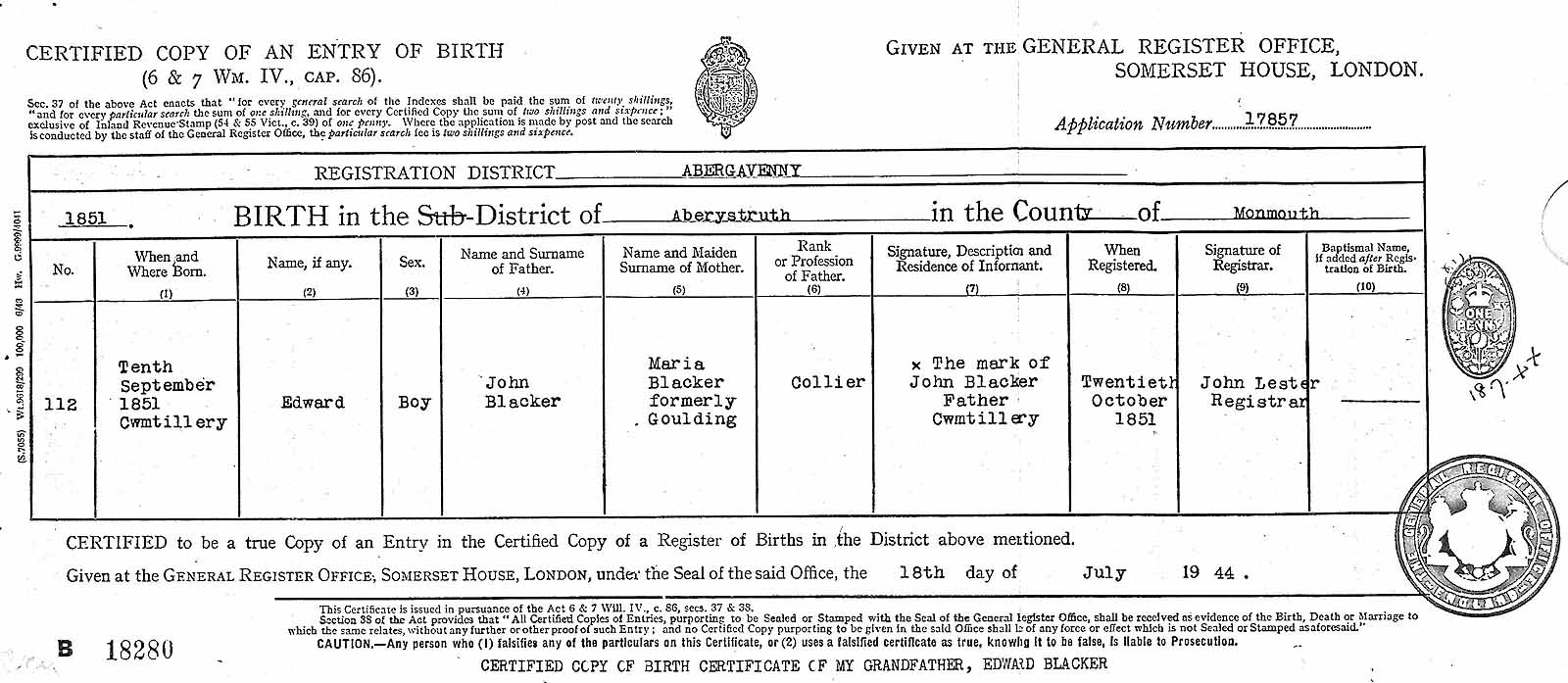 Now that we have the story of how the Wilkes's arrived in Afton, we will go back in time to England to find our Blacker ancestors. On the 18th of July, 1841, in Bristol, England, John Blacker and Maria Gould were married.(Mention might be made of the tradition in the Blacker families, that the name "Maria", is pronounced with a long "i" sound) Their sixth child, Edward, was our direct ancestor, and was born Sept 10,1851 in Cwmtillery, (Coom-till-ARY) after the family moved from England to Wales, continuing to work in the coal mining industry. At times, Monmouthshire, the county in which he was born, was claimed by England, but at other times, as part of Wales, hence the confusion as to the country of his birth. Eventually, the family moved to Mountain Ash, Wales, where Edward met and fell in love with a young lady by the name of Merintha Althera Loveday