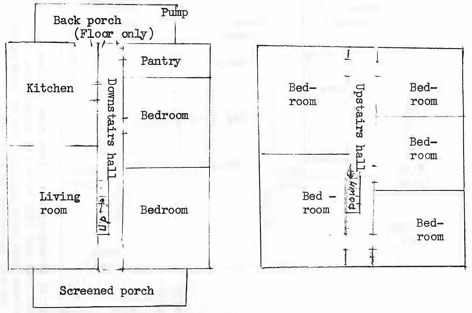 No housewife would find her lot easy who had to house her family of eight in a two room log house. The floors were of rough boards and these are not easy to keep clean under the best of conditions. There couldn't have been much floor space left to view with the furniture and eight pairs of shoes standing on it. Bed-down time was undoubtedly a challenge, for most of the children had to sleep on the floor. It so happened that the former owner had built a small shed, which technically was called a milk house, a short distance from the house to the north toward the corrals. This also had a dirt roof, but the roof was low and in envisioning how improvements could be made, the family decided that if that building could in some manner be attached to the house, it would make more room. Room was so badly needed, so planning and engineering were put to use and it was decided that if the roof of the milk house could be raised to the level of the roof of the house, and the several foot space between the two could be enclosed and roofed, the added section would supply at least a couple additional bedrooms. How soon this project was completed we have no way of knowing, however it is very possible it was not done for two or three years following their moving to the Valley.