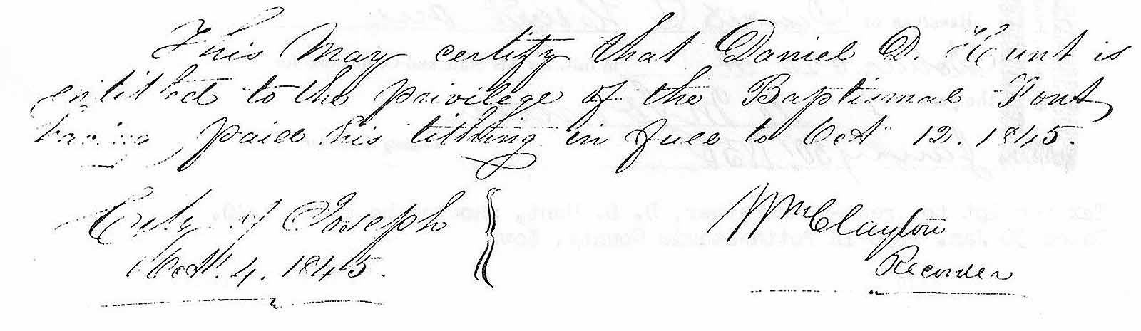 It must have been due to the fact that they did not live in a branch of the Church, that she didn't have her children baptized when they became eight years of age, the normal age of baptism in the Mormon Church. In fact, it was not for two to three years following their arrival in Almy that her second and third children, daughters Sarah Ann and Mary, were baptized despite the fact that they had moved into a community heavily saturated with the Mormon Church. Edward George, the eldest son was then twelve years of age, but did not become baptized. Sarah Ann was ten and one-half years old at the time of her joining the Church. If records are correct, daughter Mary made up for any neglect on the part of the older children for she actually 'jumped the gun' a little and was baptized two months before her eighth birthday. Such is possible, for bishops who were 'on their toes' would sometimes recommend youngsters to be baptized a little early if they lived in communities where it may have been deemed too cold to baptize in open streams during winter months. This could be very possible in Almy, for the winters are quite severe.