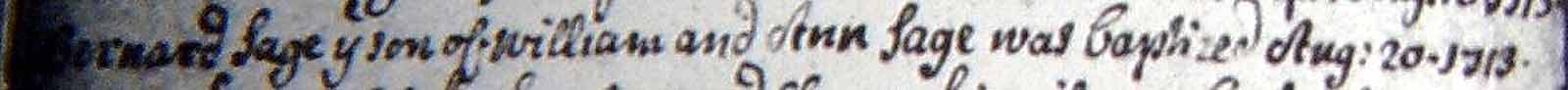 Barnard Sage ye son of William and Ann Sage was baptized Aug. 20-1713