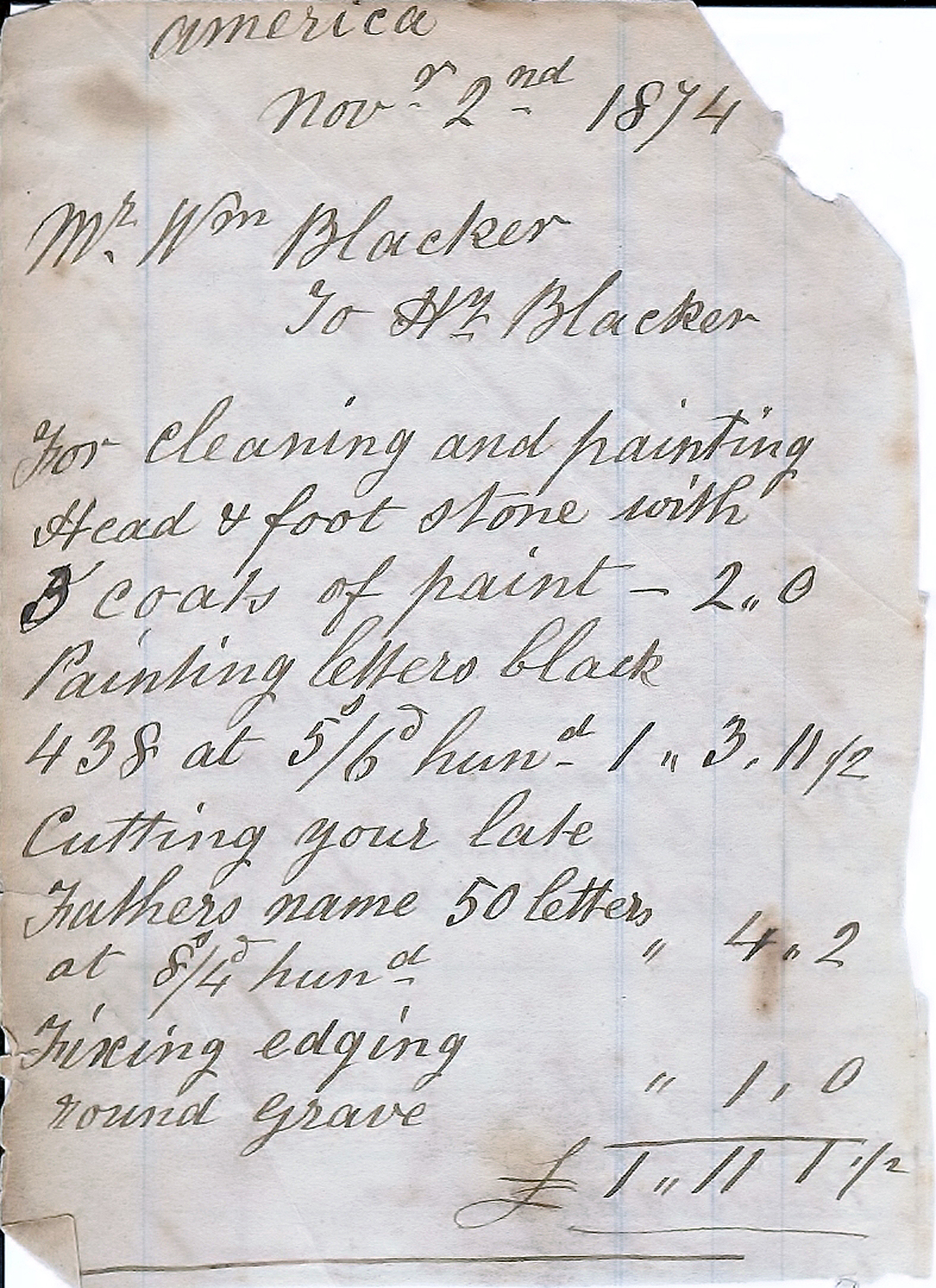 "At this time I wish to apologize for not answering your most welcome and very interesting letter and also to say I was very much interested in those letters from F. Blacker of Clutton, (this is the Frederick this history dealt with in chapters two and three. L.B.) he seems to have quite a lot of information about the Blacker family. He said that a William Blacker had sent his father one pound eleven shillings, one and one-half pence to renovating and engraving his father's name (on an already existing tomb stone. L.B.) Well now, I must tell you that William Blacker was my father and that money was sent from Nova Scotia. I did have the receipt up until a short time ago. He also said he (Frederick) had been to see a George Blacker when quite a small boy. My father was back in England, In think it was in the summer of 1873 and at that time Grandfather was hale and hearty, (She is referring to her grandfather George Blacker - and Elizabeth Bowditch who had been dead for seven or eight years). Cousin Polly Blacker kept house for hm. She was Aunt Mary's daughter and had always lived with Grandfather and Mother, in fact, they raised her.