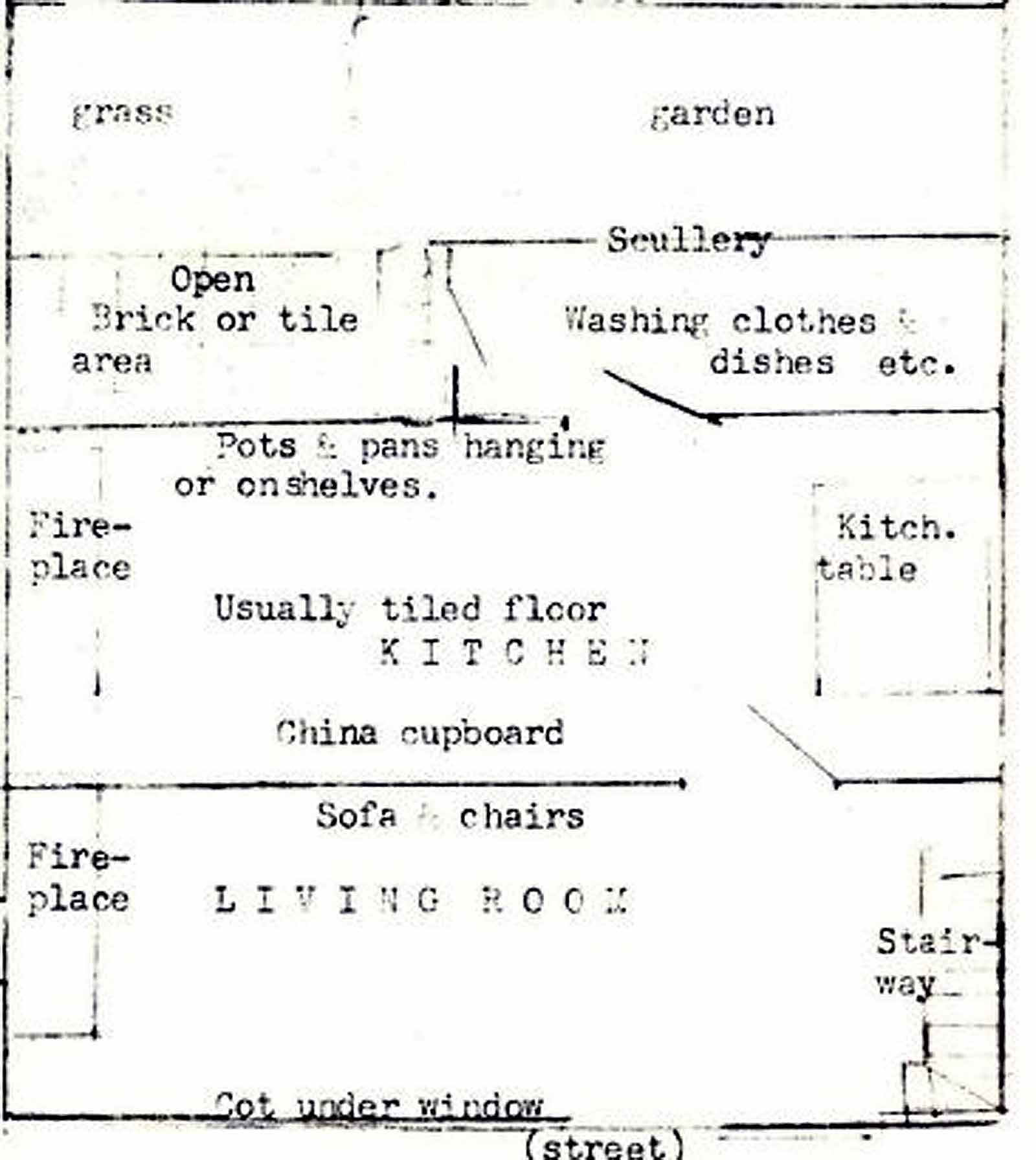 In the kitchen, naturally, was the kitchen table - usually the only table of the home - and it was in this room where much of the living was done. Beyond the kitchen was another room called the scullery - often unheated excepting thru the doorway into the kitchen. The dishwashing was often done in the scullery and, particularly, the washing of clothes, a type of washroom and storage room of pots, pans, kettles, etc. etc. From the scullery, a door would lead into a small back yard - usually a garden spot for flowers and, perhaps, a few vegetables. The whole of the backyard area was often no larger, if as large, as the area occupied by the house. Depending on the weather, clothes lines could be adapted to the yard, but due to so much damp weather, clothes-drying was often done in the scullery or even in the kitchen. Naturally outside plumbing was housed in the back yard.
