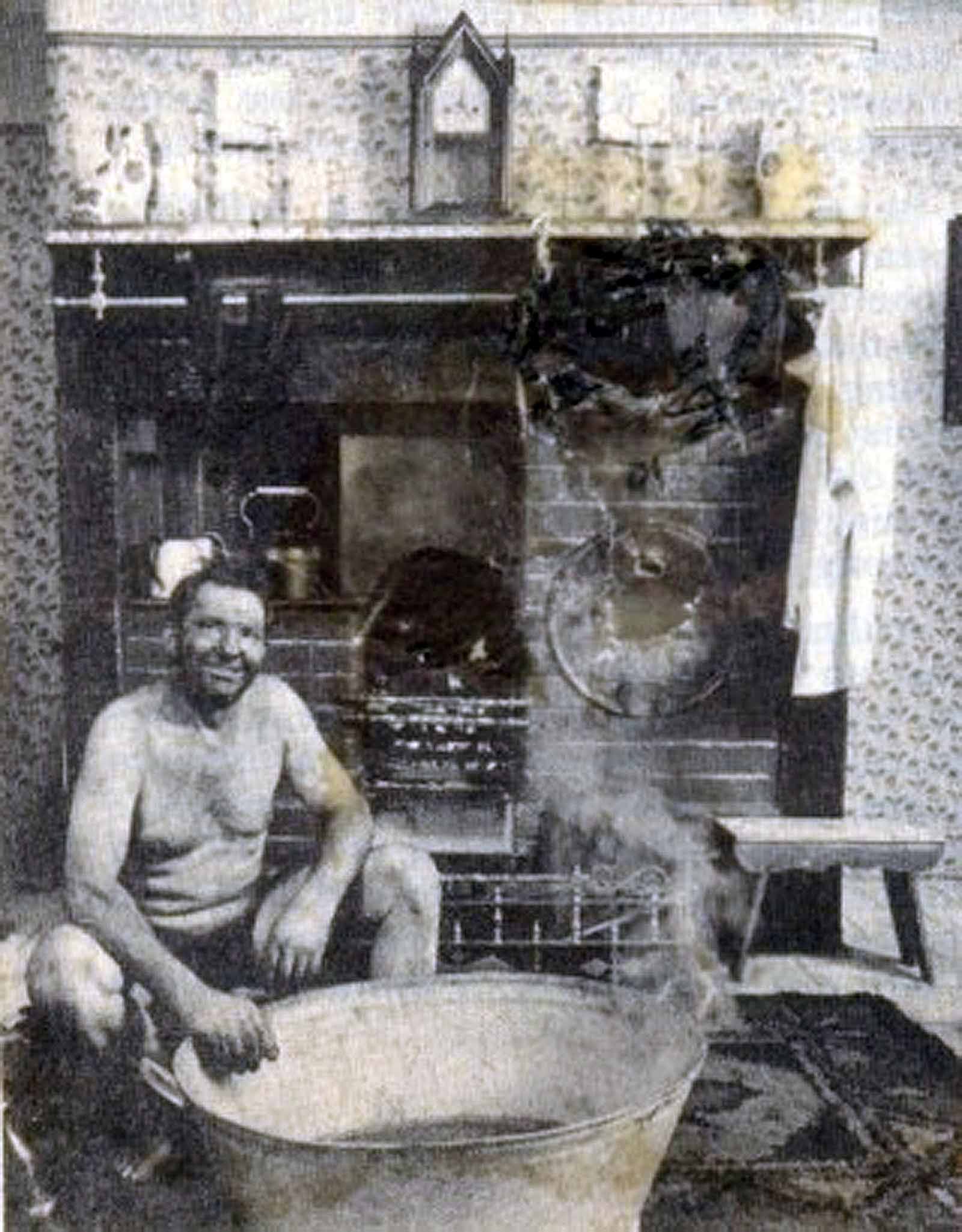 The floor plan on the right was the usual for houses such as 7 Cliff Street, Mountain Ash, into which Grandpa and Grandma Blacker moved following their marriage in 1873. The floors were usually covered with an unglazed, but polished terracotta or light brown ceramic tile. The front room often had small braid rugs or a nice self-lay larger axminster floral. This depended on personal choice and means. The stairway behind the door led to a couple of bedrooms upstairs. As the years of the 1800s wore on, the old standard kerosene lighting gave way to gas lighting which was more convenient and gave off a brighter light.Coal purchased from the coal man, who went up and down the street, usually came in 100 pound burlap bags. The coal man had regular weekly schedules such as the bread or milkman. The scullery at the back of the house was the washroom for clothes and dishes, etc. In summer the wooden-barrel tub was taken out on the outdoor tile floor. The scrubbing board or dasher was used to swish the water over and through the clothes. Coal mine clothes were not easy to get clean.