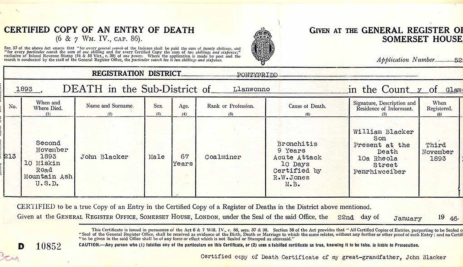 On the 2nd of November 1893, and he still living at their home at 10 Miskin Road, John passed away, still labeled as a coalminer. The cause of death was "Bronchitis, 9 years; Acute attack 10 days". Again, their son, William, was the informant. John was 75 years of age. Both were buried in Mountain Ash.