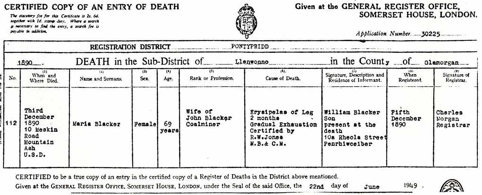 Edward's parents, John and Maria, remained in Mountain Ash for the balance of their respective lives. According to her death certificate, Maria died at her home at 10 Miskin Road in Mountain Ash on the 3rd of December 1890. She died, in the terms of the death certificate, "of Erysipelas of leg, two months gradual exhaustion". Her youngest son, Uncle William of Penrhiwceiber was the informant. She was 69.
