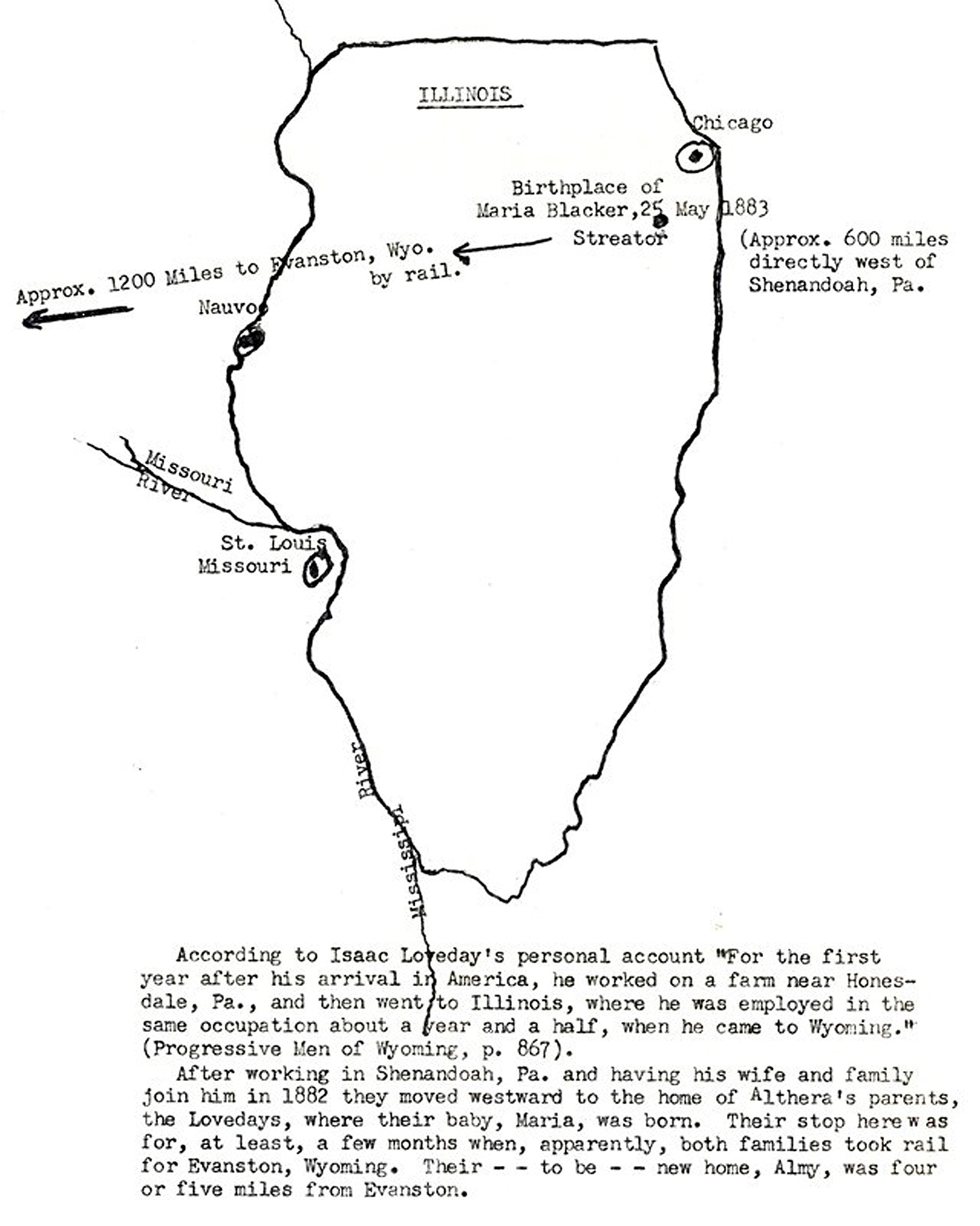 The first evidence that they did go to Wyoming is the record of the birth of a son, Isaac, 12th of October 1884. The last evidence that we have of their stay in the east was the birth of a daughter, Maria, 25 May 1883, this in Streator, Illinois.