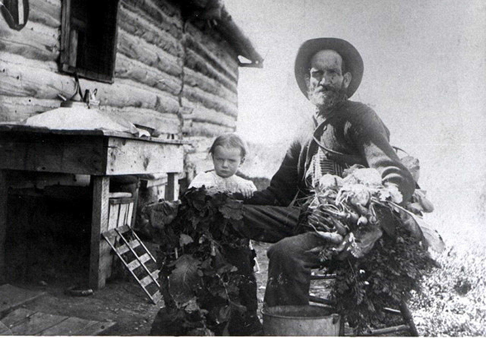 Edward Blacker holding garden produce, carrots, turnips and possibly red beets, assisted by a grandchild. This picture was taken before his death in Afton, November 27, 1910, a year after his daughter Mary Blacker Wilkes’ death, and six months after his father-in-law, Isaac Loveday’s death.