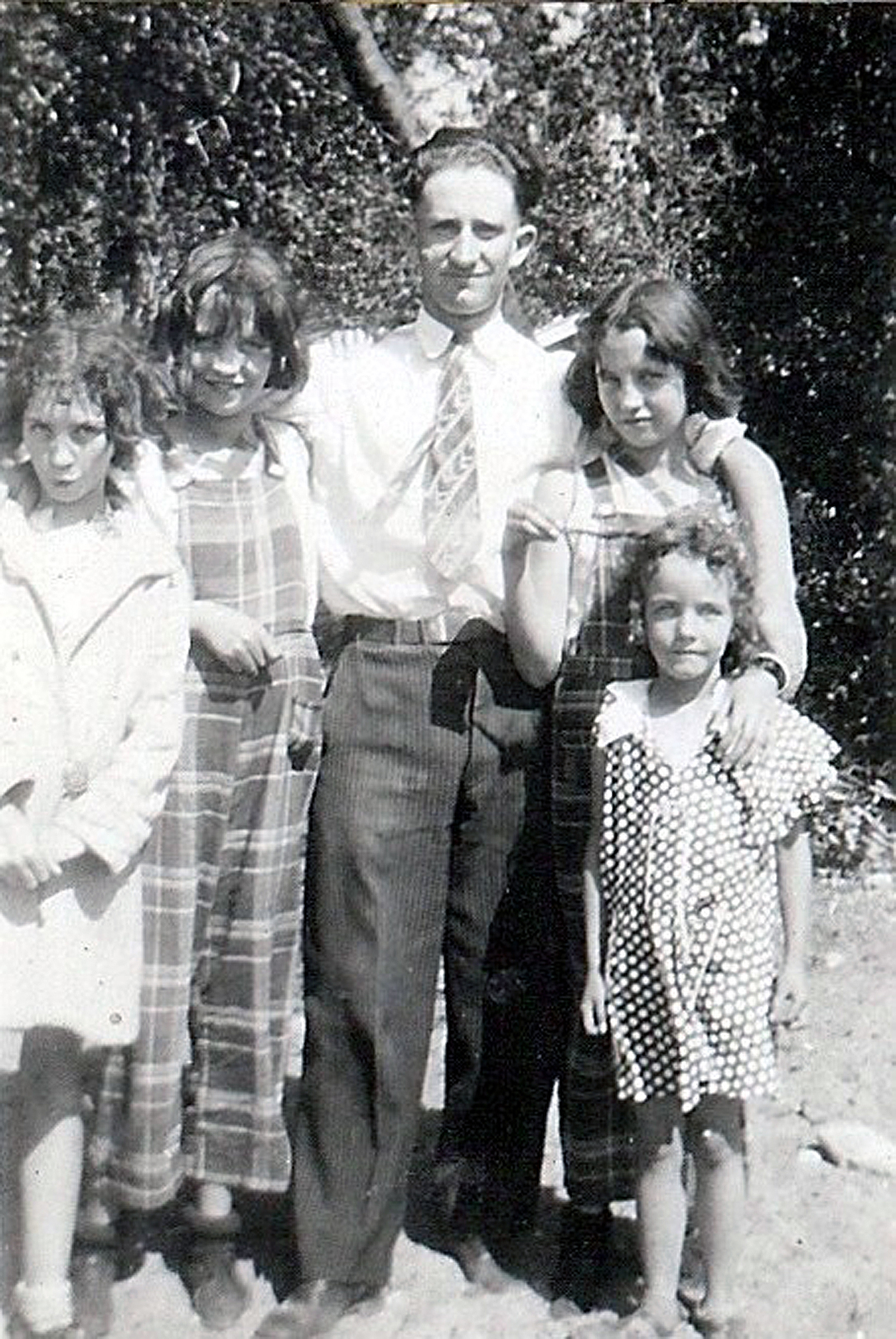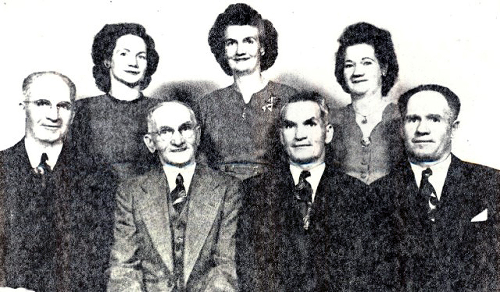 The Nisbet family in 1948. L to R: William, Uncle Arch, John and Downs. Back row: Annice, Elva and Irene.