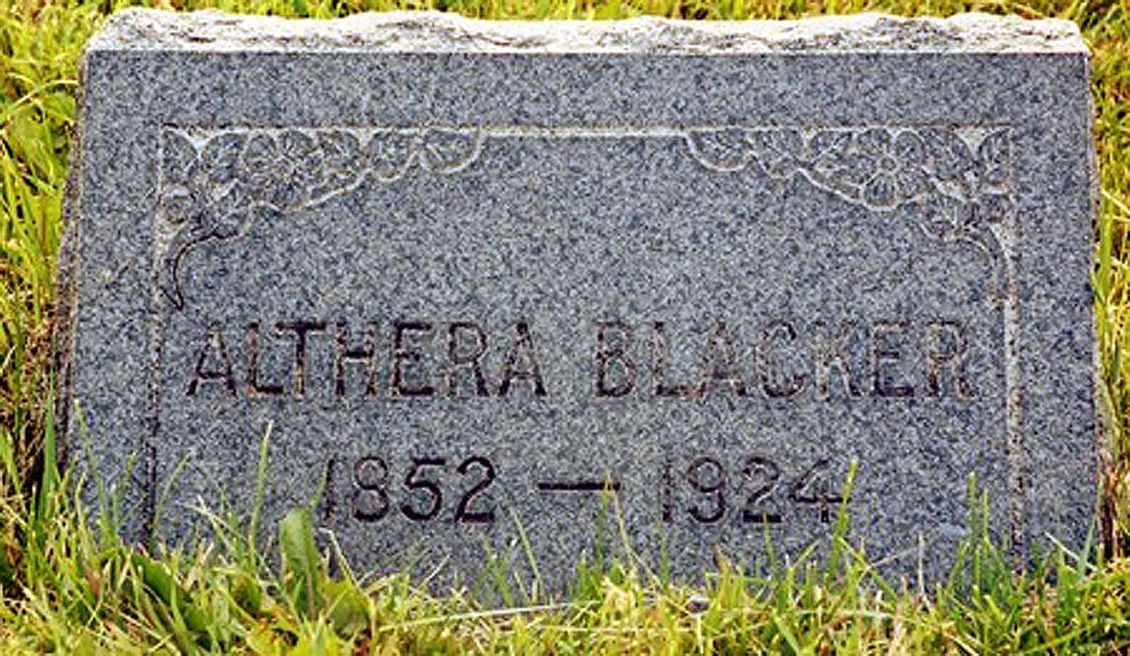 On the 3rd day of January 1924, Grandma Althera Blacker commemorated her seventy-second birthday, but she was not well, in fact, had not been in the best of health for the past several months. For nearly fourteen years, she had lived as a widow. Her mother had passed away twenty-two years before, and she, Althera, had made the long, hard trip of approximately 125 miles by buggy to their old home in Almy. There she had assisted in her mother's burial, and a stood by the side of her grandmother's grave. Ann Powell Danks, whom she knew and loved very well, had been at rest for eleven years. Also nearby, was the spot where she, with others of her family, had placed the little body of her 2 year old baby, little Isaac, this in 1886.