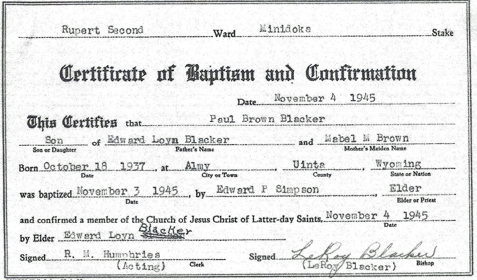 In the summer of 1942 we moved to Rupert, Idaho. Dad took over the eighty acre farm owned by his father, Thomas Blacker, and he ran and managed the farm for three and a half years. Contrary to the few memories that I have of living in Almy or Evanston, I have many memories of events in Rupert.