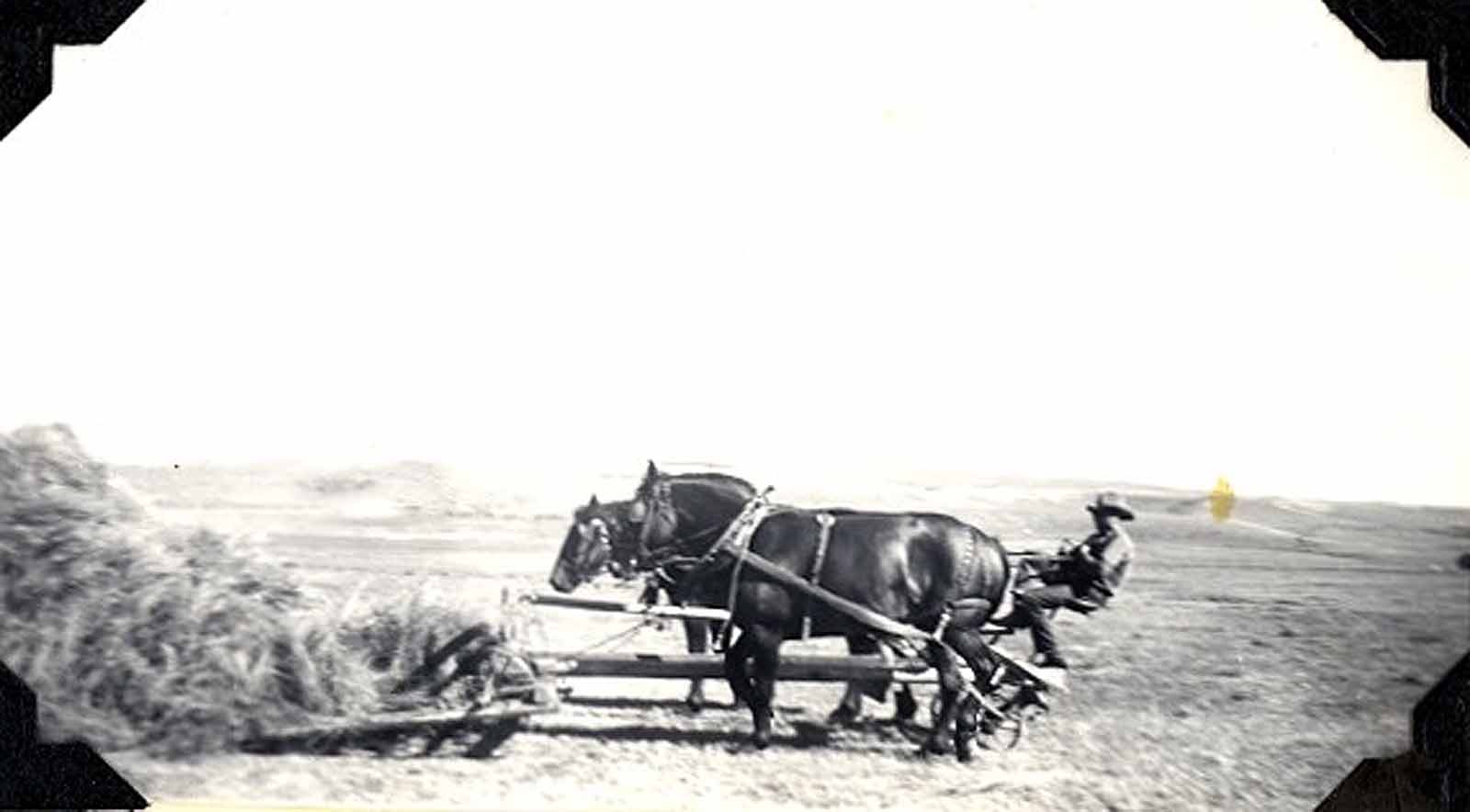 The winter of 1934 had been a very mild one and the snowfall was very light. As a result there was a water shortage the following summer. We worked hard to get the water to cover the fields, but there just wasn't enough. Day after day went by and the grass became drier and the ground harder. The fields were divided so the cattle would have enough to eat and we cut what hay we could. It was impossible to keep all our cattle so we sold to the market the best ones and the government bought the older cows and small calves. This was true of all the surrounding country. Many were shot because they couldn't be fed. This was especially true of sheep. Hundreds and hundreds were shot and put in a pile to rot. This at a time when the depression was sweeping the country and many of the animals would have provided food for people. We had some hay left over from the previous year and although we suffered a loss, it wasn't as hard as it was on others.