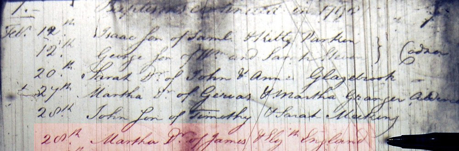 "Feb 28th Martha, Dr. of James & Elizth England".