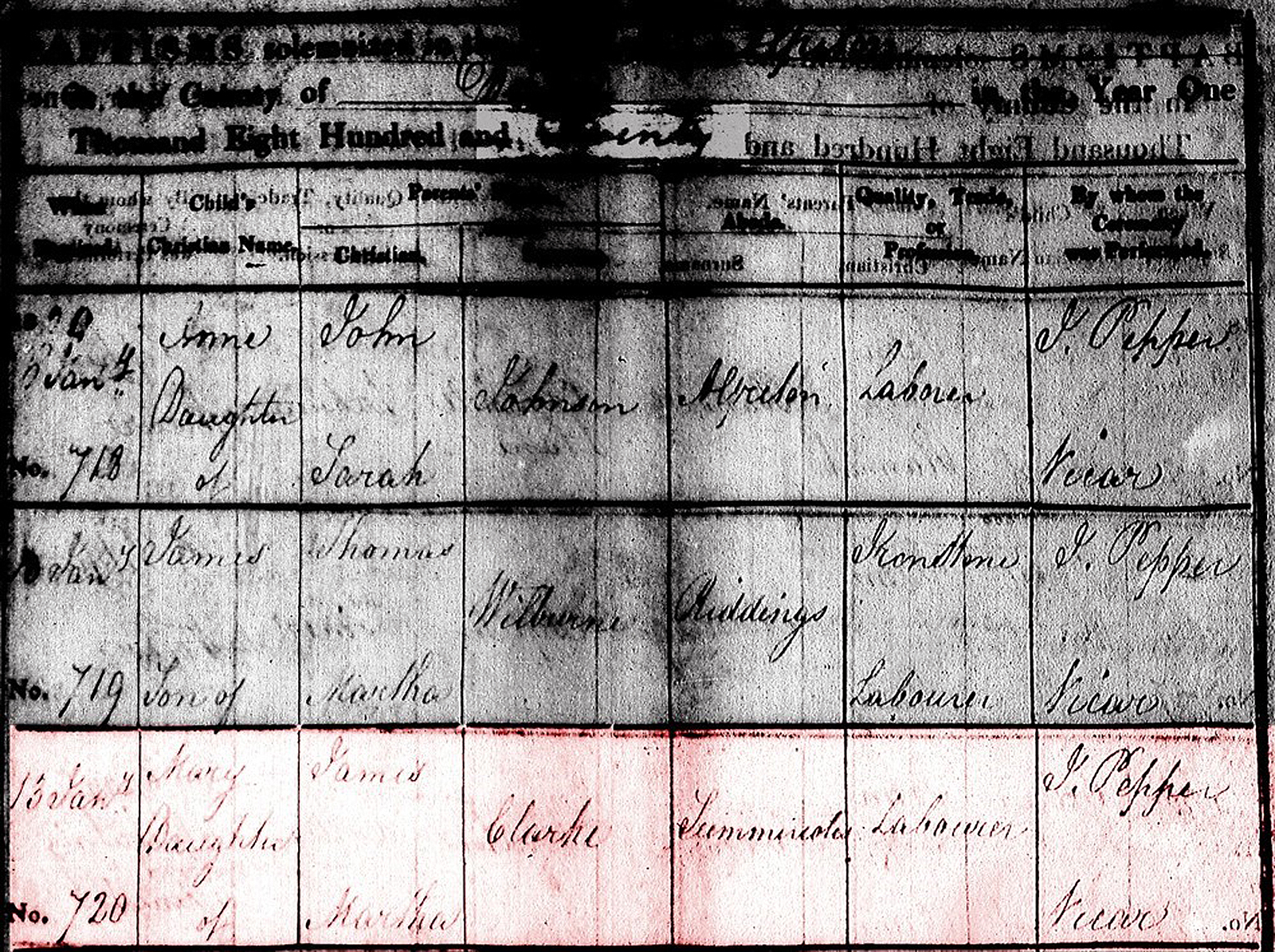 "1820 13 Jany Mary Daughter of James Martha Clarke Summercotes (Somercotes) Labourer J Pepper Vicar".