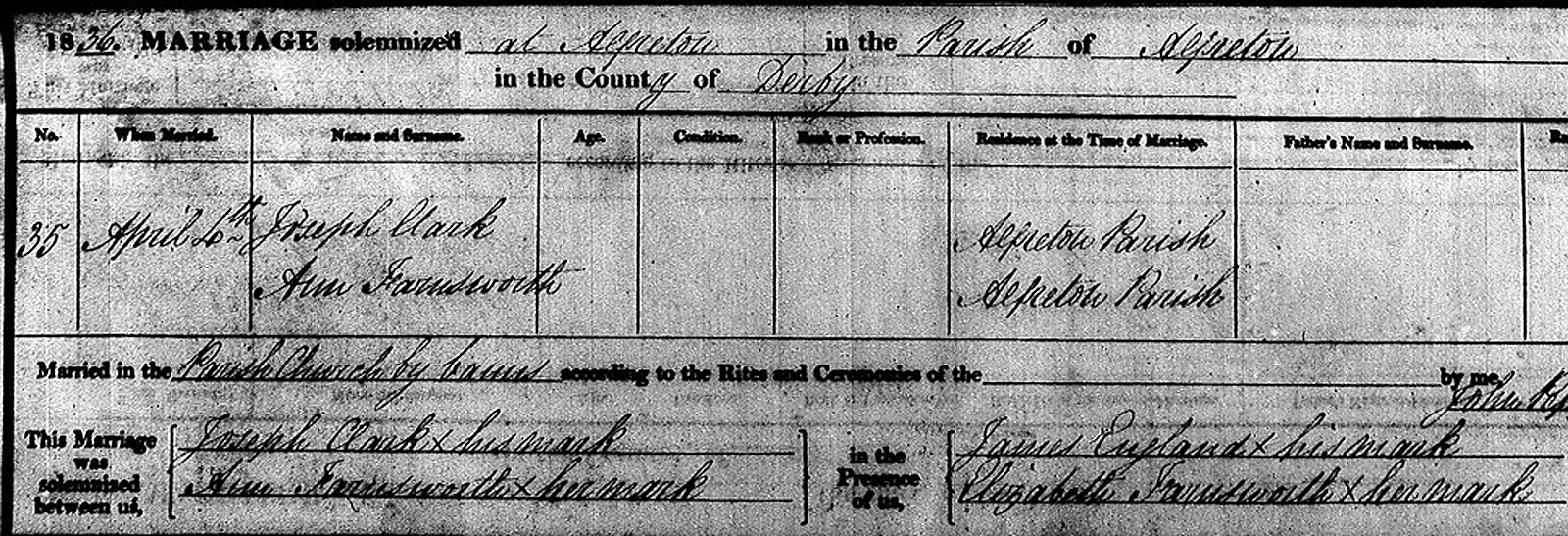 Joseph Clark was married to Ann Farnsworth 4 April 1836 in the Alfreton, Derbyshire Parish of The Church of England. Both Joseph and Ann were listed as members of the Alfreton Parish.