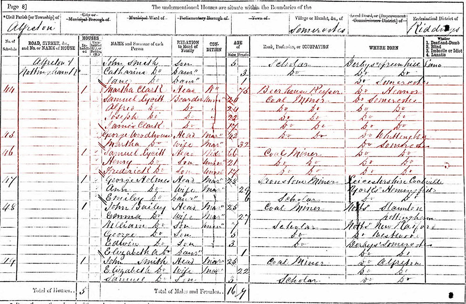 Many of these events happened while the family was living in Somercotes, Derbyshire, England. At that time Somercotes was a part of the Alfreton, Derbyshire Parish of The Church of England. There was no Church of England chapel in Somercotes then, so most of the events took place in St. Martin's Chapel in Alfreton. In 1852 Somercotes became part of the Riddings, Derbyshire Parish and the parish built a Chapel of Ease in Somercotes and dedicated it to St. Thomas.