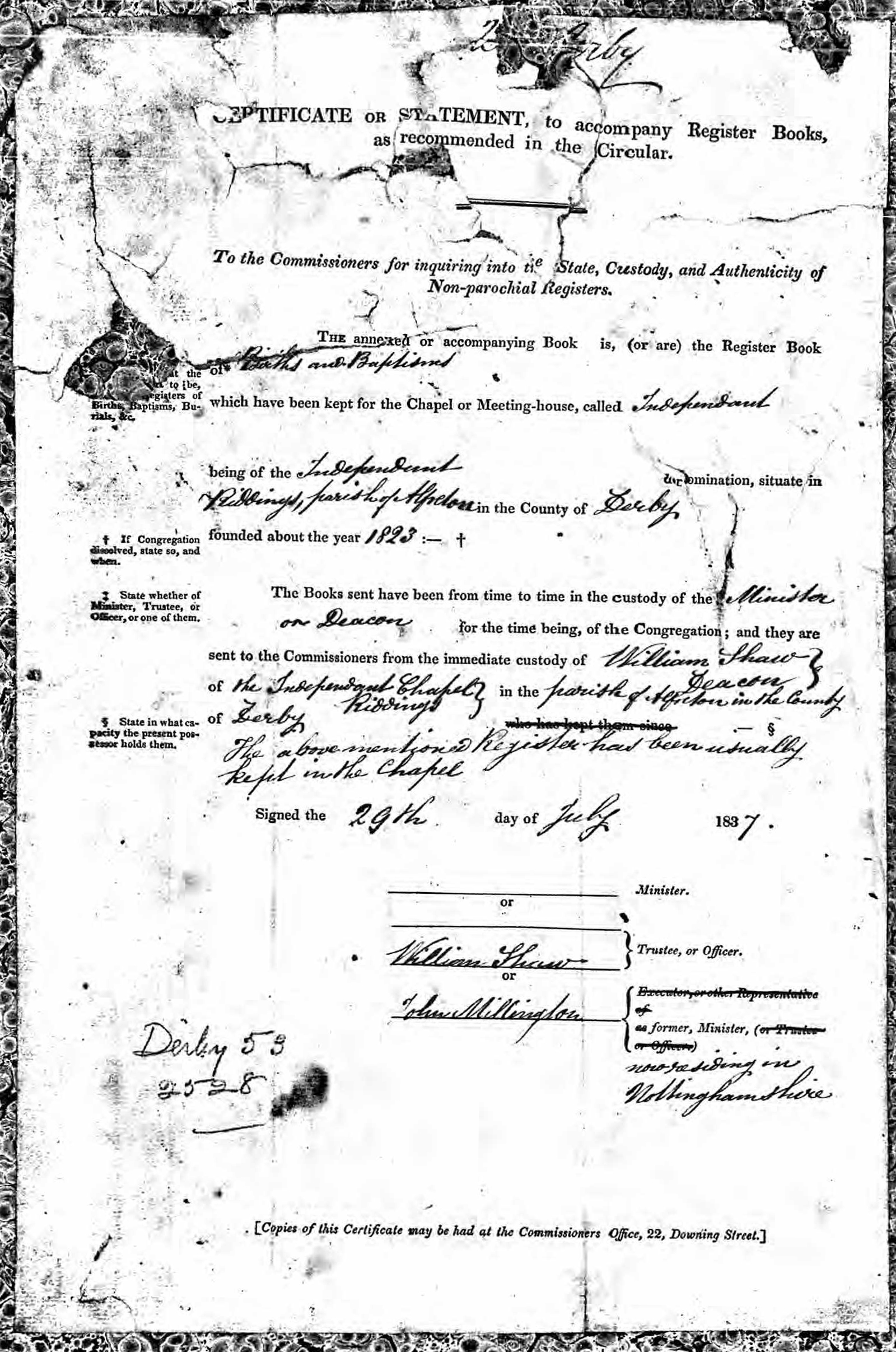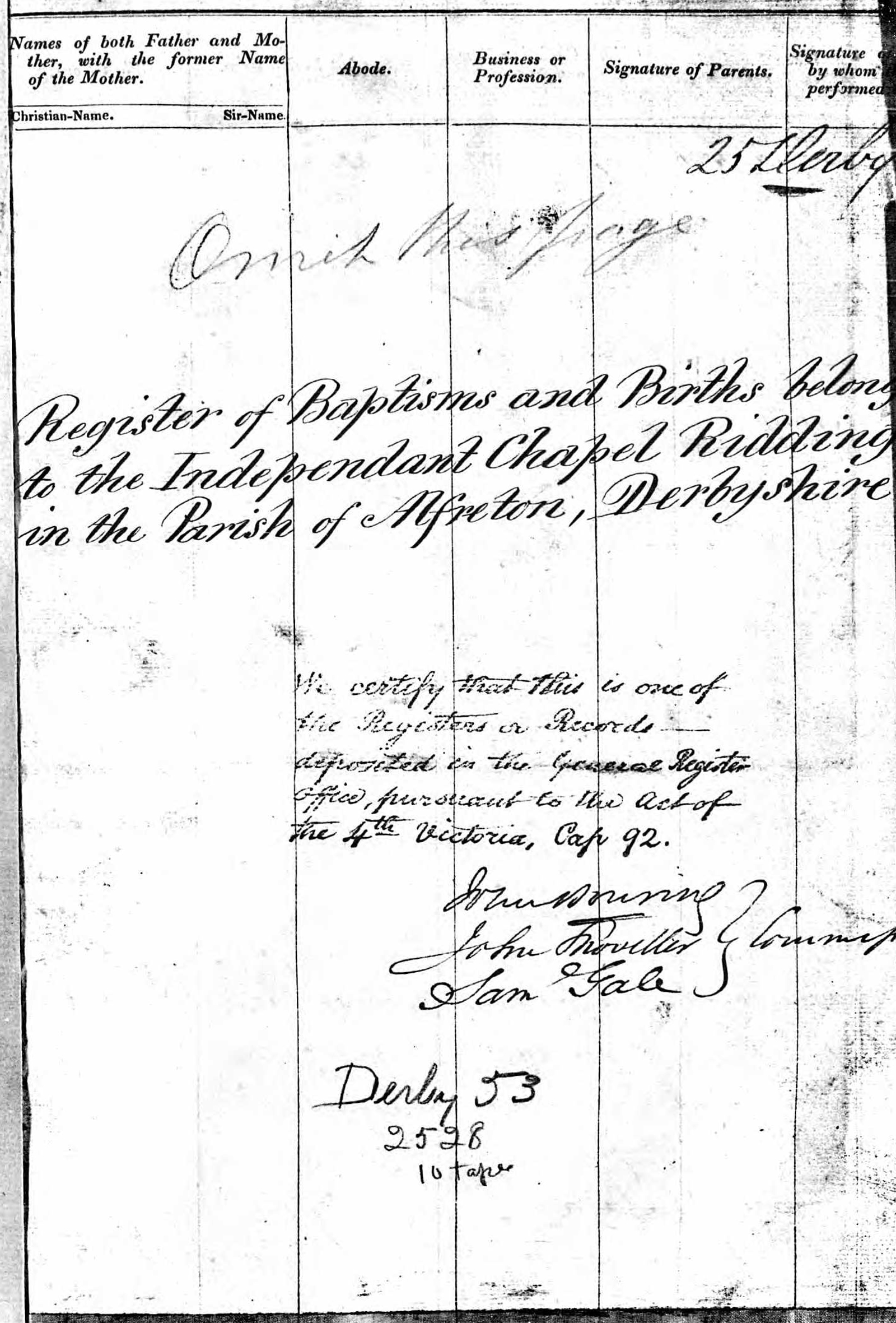 In 1823 the Independent Chapel of Riddings, a non-parochial church, was formed in Riddings, Derbyshire, a small village near Alfreton and Somercotes. The image below shows the certificate or statement to the Crown that registers it as an official religious group.