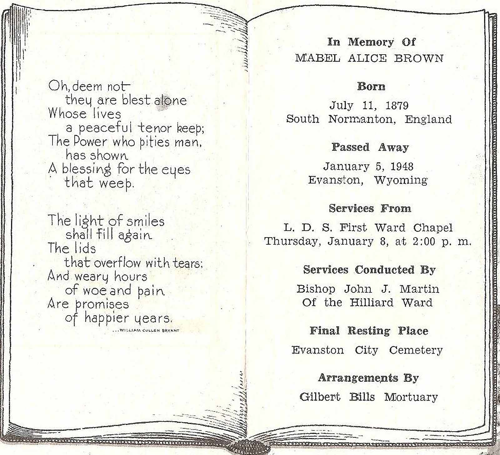 Violet seemed to be improving, so Mother came to visit us in Rupert. While she was with us, Violet died. Louise called us and Loyn and I had the sad task of telling Mother. This was something Mother never got over. Mother wasn't well at the time. She had a bad cold and cough, and the doctor even advised her to not go to the funeral, but she did. The funeral was held in the Evanston 1st Ward chapel. Just before the close of the services, as the closing song was to be sung, Mother had a coughing spell so bad that she had to leave. I went outside with her, and someone got her a drink of water, and the spell left her. She and I stood on the outside listening to the song and prayer, and Mother said to me, "Here's the meaning of both my dreams - Father wanted Violet for some reason, and here we are listening, just like I dreamed it." Violet died in Ogden the 5th of April 1945.