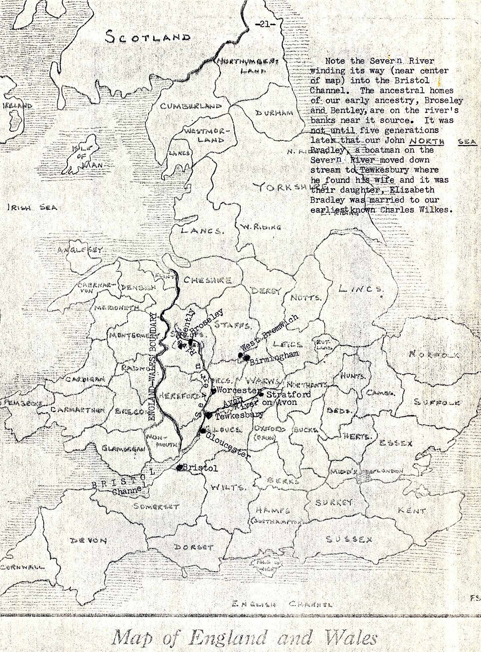 Let it be clearly understood that we are not disputing, in the least, that there could have been a son, John. This is entirely possible for there is no date conflict showing up. From the nature of this newly reported date, it would indicate that it would originally have had to have come from the parish record. On the 7th of October 1955, the Salt Lake Genealogical Library received from our professional researcher in England, a copy of all marriage, christening and burial entries from the Tewkesbury parish records which applied to all of our ancestral lines - Wilkes and Bradleys -between the dates of 26 Jan 1709 and 2 July 1779. This copy of parish transcripts was subsequently mailed to this writer, and at the moment of this typing, is at hand for closer scrutiny. No burial entry is included in the Tewkesbury parish for a John, buried in 1770, nor is the name found in the parish records of ten additional parishes neighboring Tewkesbury, which are included with the afore mentioned copy of transcripts.