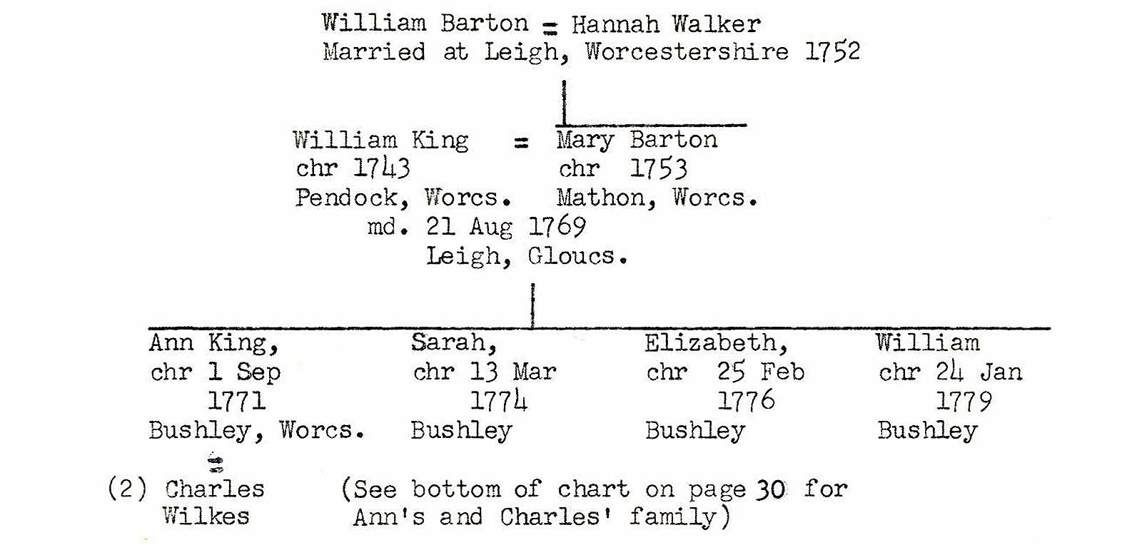 Ann King was the eldest of four known children, three girls and a boy, all christened within the decade of the 1700s. The four of them were christened in the Bushley parish. Their parents, William King and Mary Barton, were not christened there, nor seemingly no known progenitors were there prior to this particular generation. The parish register was searched from 1538 to and including 1812. The Genealogical Society, in a letter dated 8 January 1960, reported that another twenty-five parishes in the area were searched for the period 1739 to 1753. A christening of a Mary Barton was found in 1753 at Mathon, Worcestershire, a small parish with a population of fewer than 700 people, some twelve miles north and west of Tewkesbury. Her parents, William Barton and Hannah Walker, were married at Leigh, approximately ten miles north and east of Tewkesbury. While the Society felt these to be ancestral, they suggested that they be put on "hold" for further documentation. Throughout the years since, nothing more likely has developed. With this caution to be kept in mind, Ann King's probable parents and a set of probable grandparents will be charted. (Please keep in mind Ann's grandparents and her mother's chr. date and place are not proven.)
