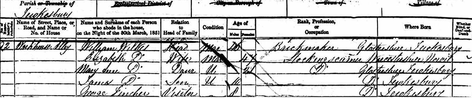 Prior to the searching of the 1851 census shown above, we had already become aware of five additional children, and naturally wondered why they didn't appear on this census with the rest of the family. Eldest daughter, Hannah, would have then been twenty-six years of age, and undoubtedly had married. Son, William, our progenitor, had married in 1846 at Tewkesbury. These two would have had homes of their own. Next daughter, Mary Ann, twenty-one was at home. Where were the next three girls, Elizabeth, nineteen, Sarah, sixteen, and Eliza, thirteen? The census taker listed only the ones who were at home at the time. It is quite possible Elizabeth had already married, or as many young girls did at that age, could have found employment in another home, or in a business too far away for a trip to be made home each night.
