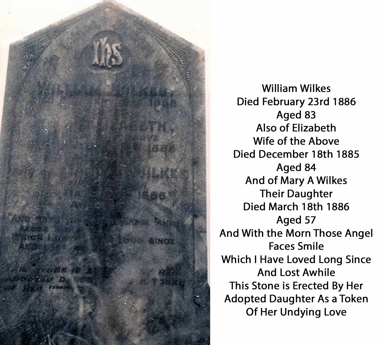 Throughout the centuries in England, it has been the practice to bury more than one person in a grave - the first to the bottom, the next just above, the third above that until, perhaps, as many as six in a single grave. The particular headstone I had located, when scraped and brushed off, showed that the grave contained the bodies of three persons, namely, and these are the exact extractions I am this day (1984) copying from the notebook I copied into on the 3rd day of February 1930: WILLIAM WILKES, died Feb. 23 1886, age 83; also of ELIZABETH, wife of the above, died Dec 18th 1885, age 84; and of MARY A. WILKES, their dau., died March 18, 1886, age 54. Thus, the full inscription of my 2nd great grandparents' headstone. There were other stones, which I copied, which appeared to be of the family, which I shall not include at this point.
