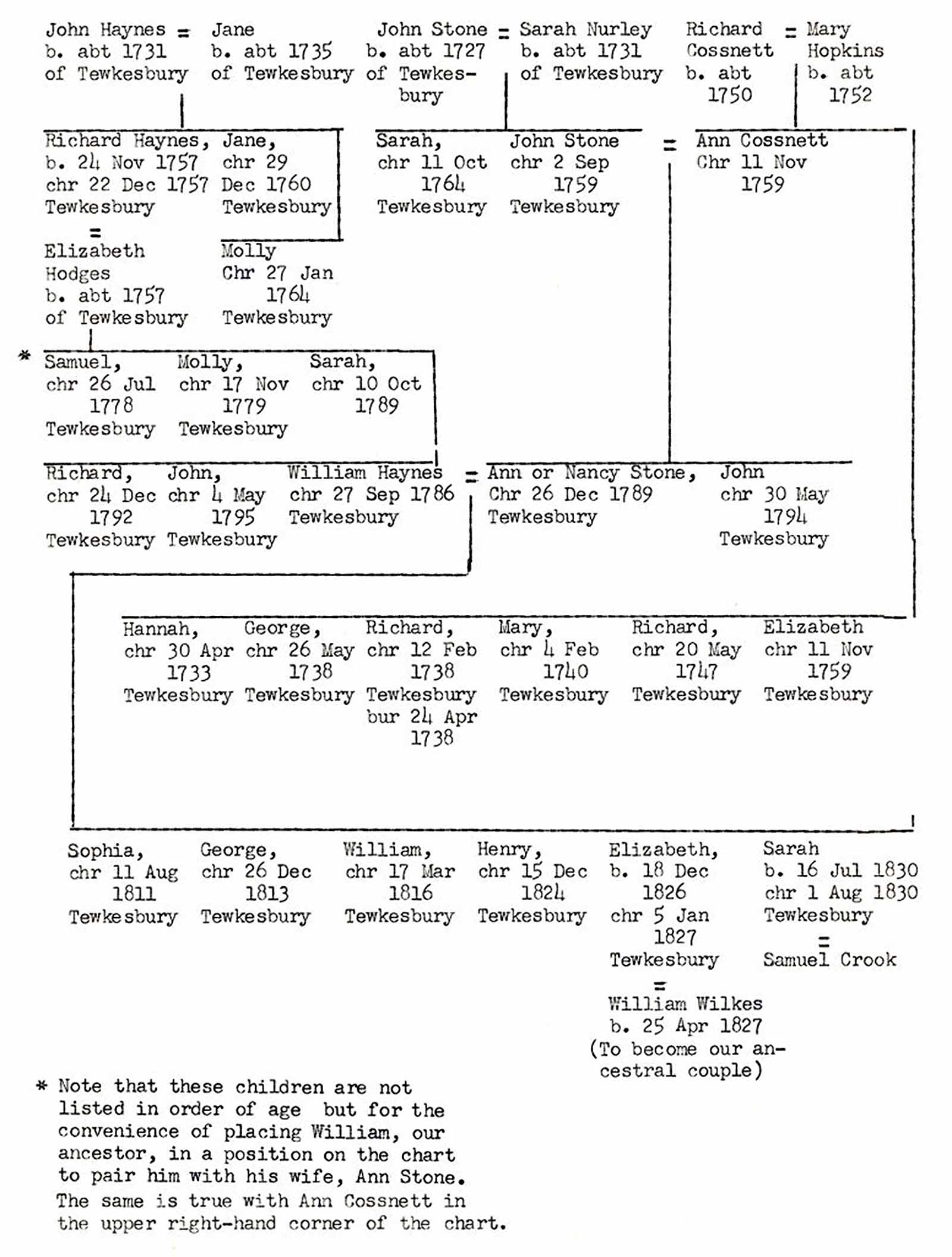 It is to be hoped the reader will review the above paragraphs and compare the names listed with the chart on the next page. Perhaps the chart will place in mind a little better, the ascendancy of ancestral lines of Elizabeth Haynes or Haines, the writer's great-grandmother, who married William Wilkes Jr., as shown near the bottom of the chart.