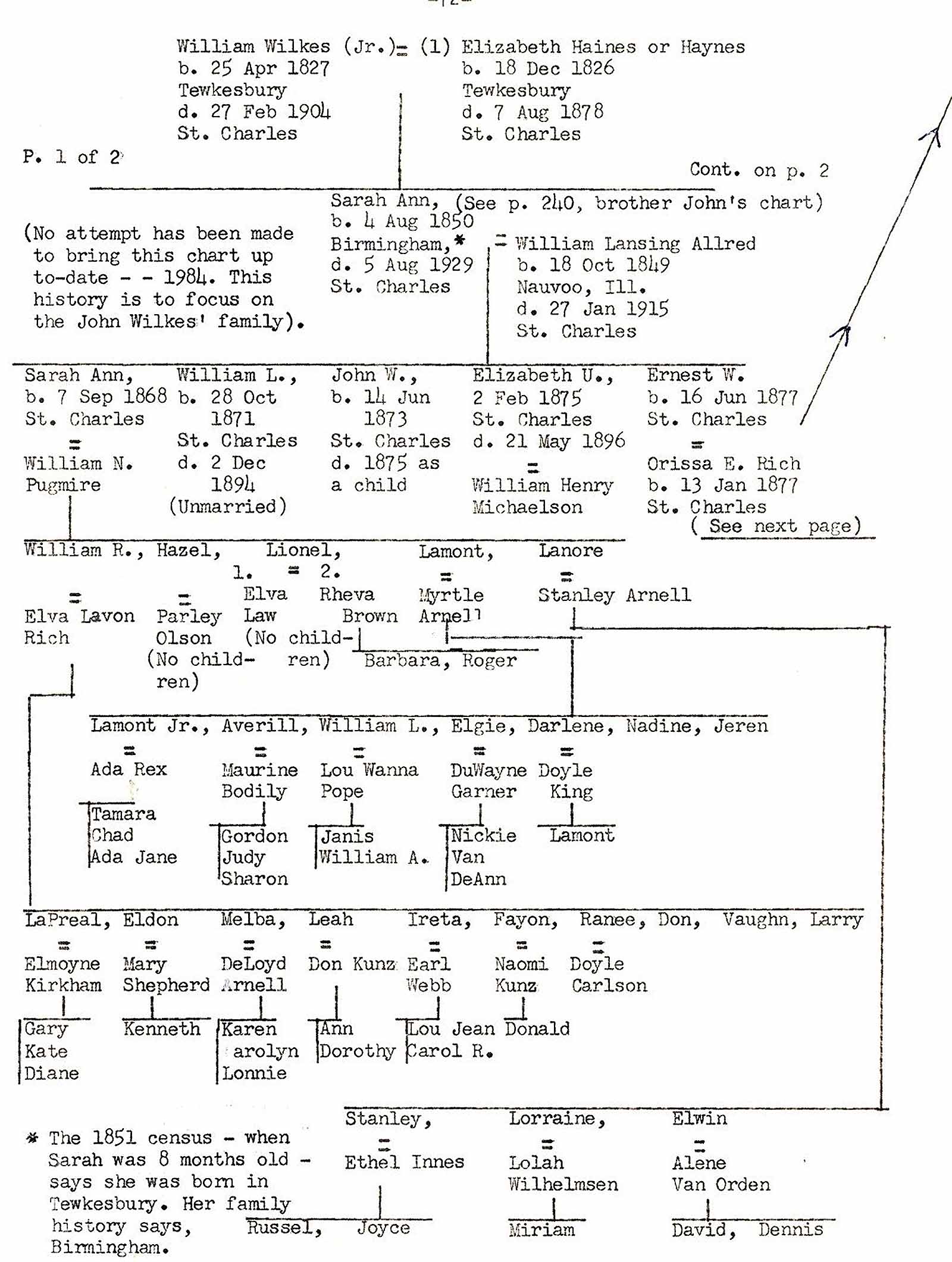 It may be here mentioned that no attempt has been made to extend the family charts of the other branches of the William Wilkes' families, other than of his son, John's descendants, other than the ones shown which information had been gathered through the years. The project would have become overwhelming had an attempt been made to bring the charts completely up to date.