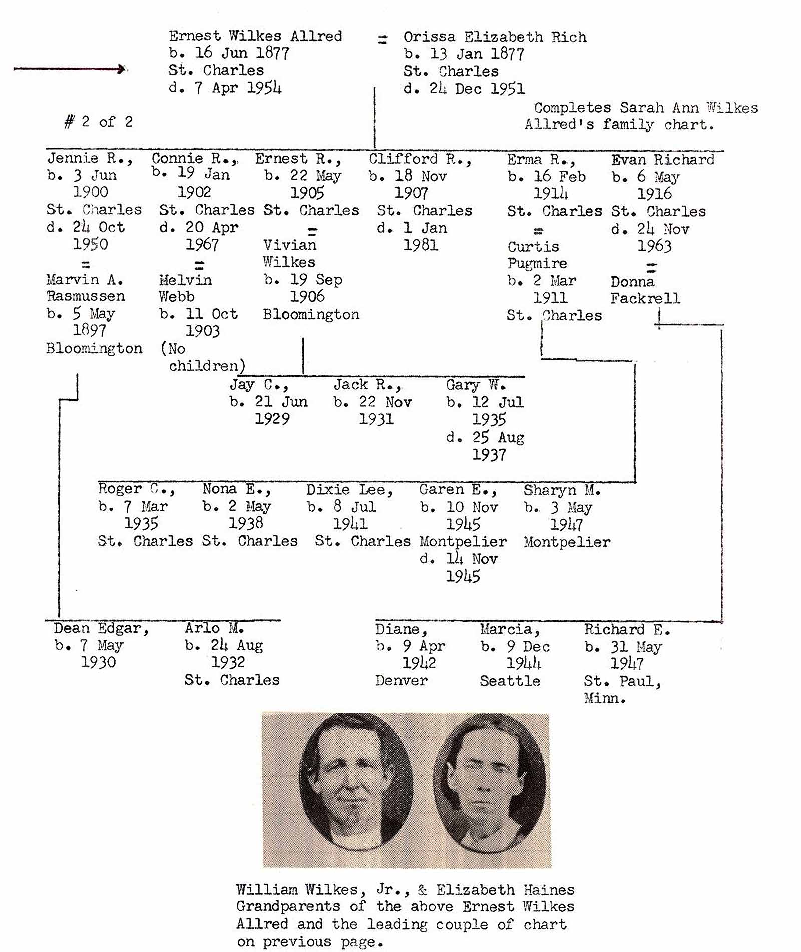 This writer received an interesting bit of St. Charles' historical information from his second cousin, Erma Allred Pugmire, on the 4th of August 1938 in answer to a query as to whether she could give historical family data. Erma is the daughter of Ernest and Orissa Allred, a son of Sarah Ann Wilkes Allred, the only sister of our John Wilkes. A portion of Erma's letter is quoted:
