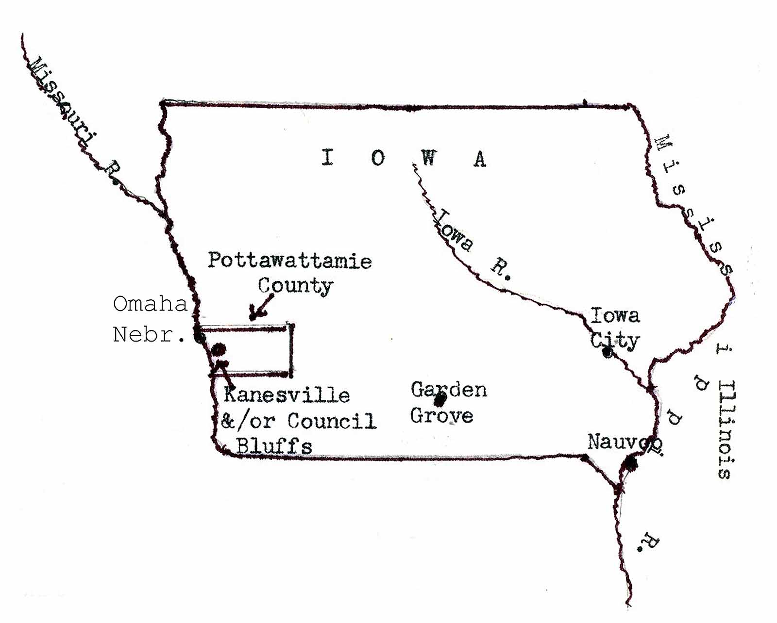 The John A. Hunt wagon train left Iowa City 1st of August 1856. This sketch of the map of Iowa is as applicable to the Hunt family as it is to the Eynon family.