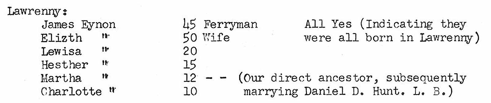 The Wilkes' family record has long shown that Martha Eynon's parents were James Eynon and Elizabeth Griffiths of Lawrenny Ferry of Pembrokeshire, Wales, and they had seven daughters between 1819 and 27th of July 1830.