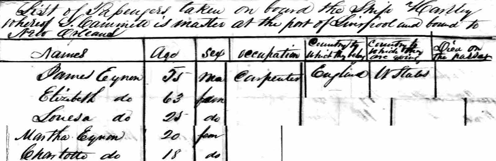 According to family records Elizabeth Eynon died 1 June 1843 in Wales. As can be seen James' wife Elizabeth is listed on the manifest, so she did not die in Wales as the family has supposed.