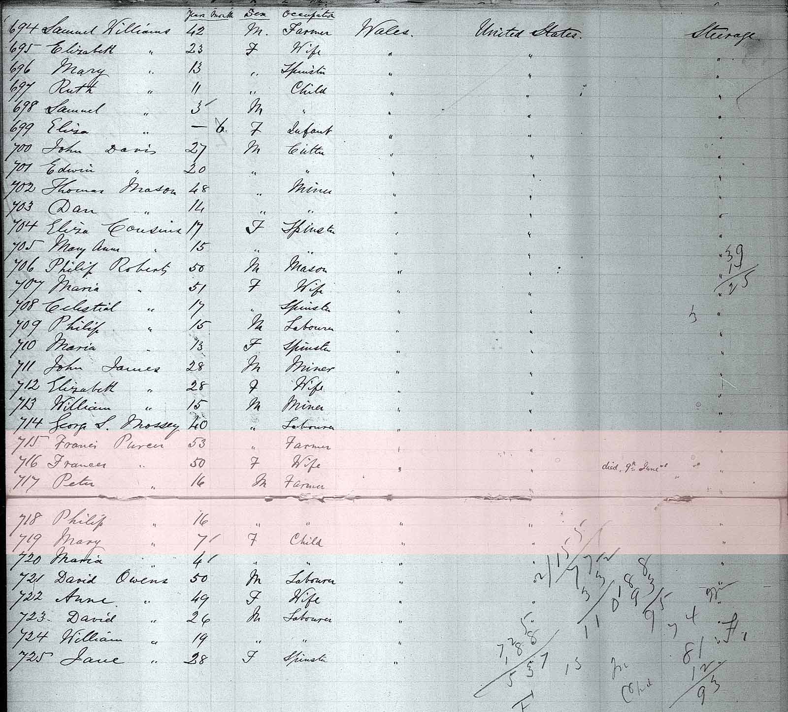 We have made no attempt to search the boat record of that branch of the family so we have nothing to report. If we had that record we would know whether or not all or part of the family left Wales at the time. Other than the three children mentioned above with their ages, the next children in descending order would be Peter 18, Phillip 15, Charlotte 12, Almira, four months short of being 8 and little Marie just a month past her 6th birthday.