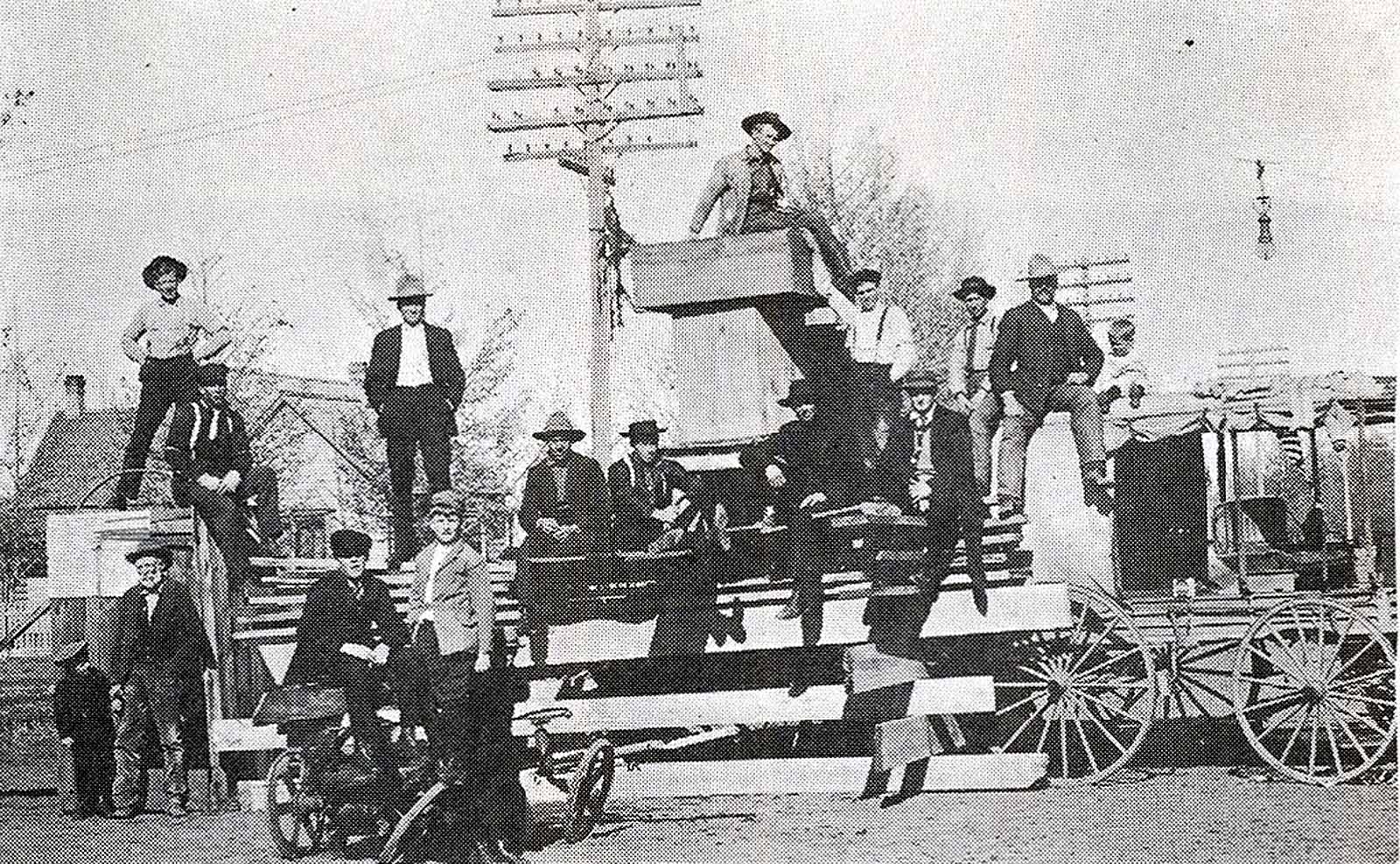Yesteryear's Halloween pranksters had fun blocking Main street with all that wasn't tied down, such as this picture shows, apparently, also, to the delight of the city fathers. Roe Hale, the Marshall, is sitting at the top of the white-top buggy. Note the riding sulky plow in front. See Grandpa John Wilkes with grandson, DeLoyd Wilkes, by his side in the bottom left corner. Could it have been Grandpa's little outhouse directly behind him, on which a man is standing and another sitting? The Wilkes' town home shows thru, directly behind them. Burton's store would be on the near side of the street in front of the white-top buggy, but not shown. This picture couldn't have been later than about 1910. DeLoyd, shown in the picture, passed away in April of 1913, at the age of ten.