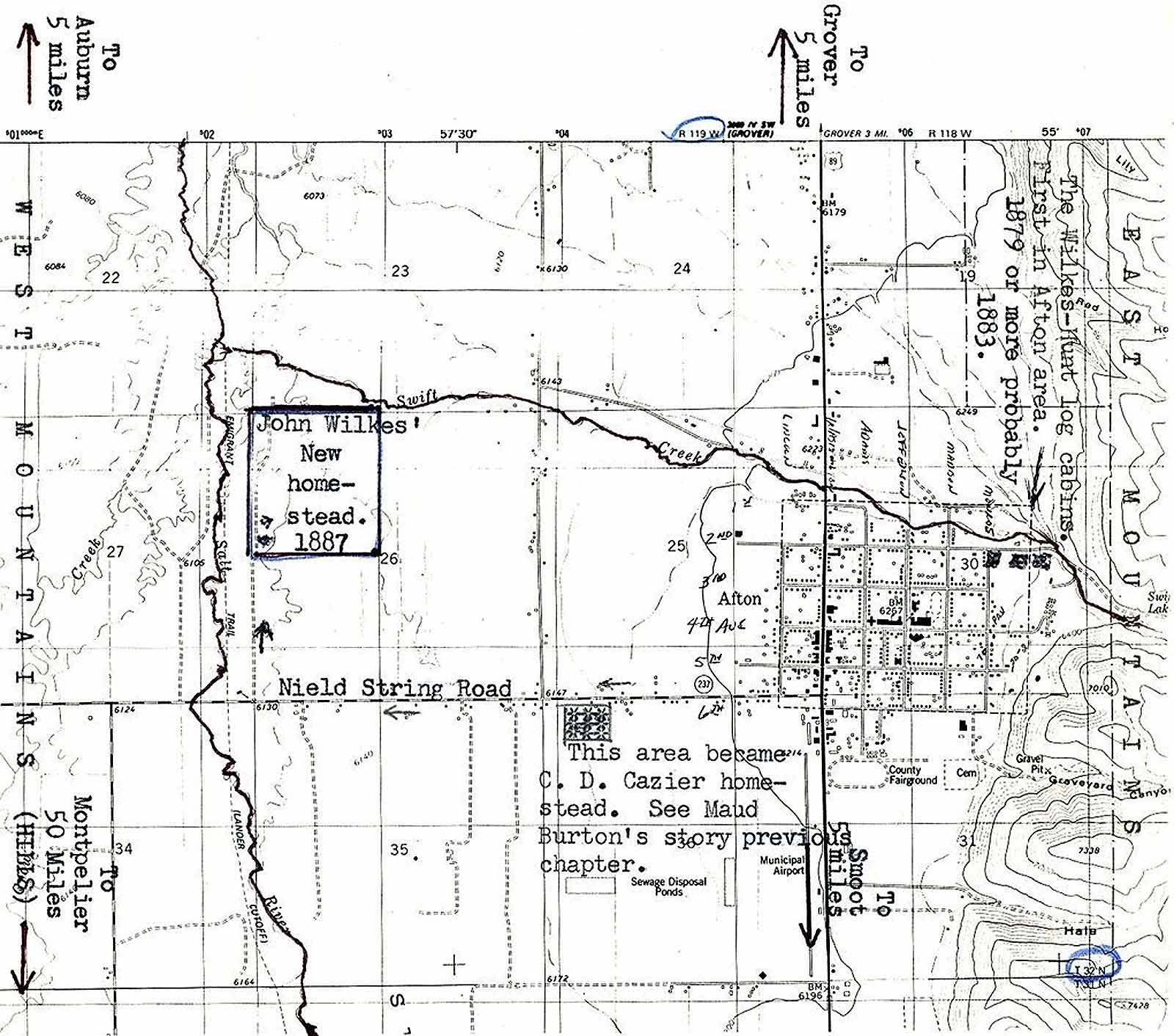 Note that section 26 is labeled near center of map and the northwest quarter is outlined. For many years, there has been no house nor farm buildings on this piece of property. It remains simply meadowland. Inquiring of close friends, Bryce and Mona Nield Allred of Burley, Idaho, and from whom the history of Afton, written by Maud Burton, was obtained and which was copied in the previous chapter, they, the Allreds, moved from this very area on the map some fifteen years ago, report the probably route from Afton to the Wilkes' homestead would have been leaving the southwest corner of Afton, going two miles west and thence one-half mile north - west on Nield String Road.