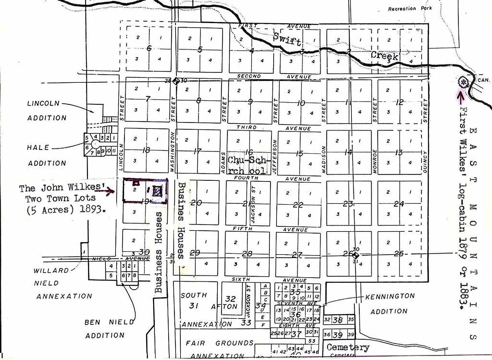 It can plainly be seen now where Grandpa Wilkes' thoughts were during the years the family was struggling on the 160 acre homestead. He was working his way toward town. In all likelihood, as soon as he could get title to the homestead which would provide him with assets, providing he then sold it, which would permit him to construct a house in town. The deeper we involve ourselves in the story, the more easily it is to believe that this favor of obtaining these choice lots was the result of a previous agreement with the original town fathers when the John Wilkes family had returned to their original cabin in 1887 or 88.