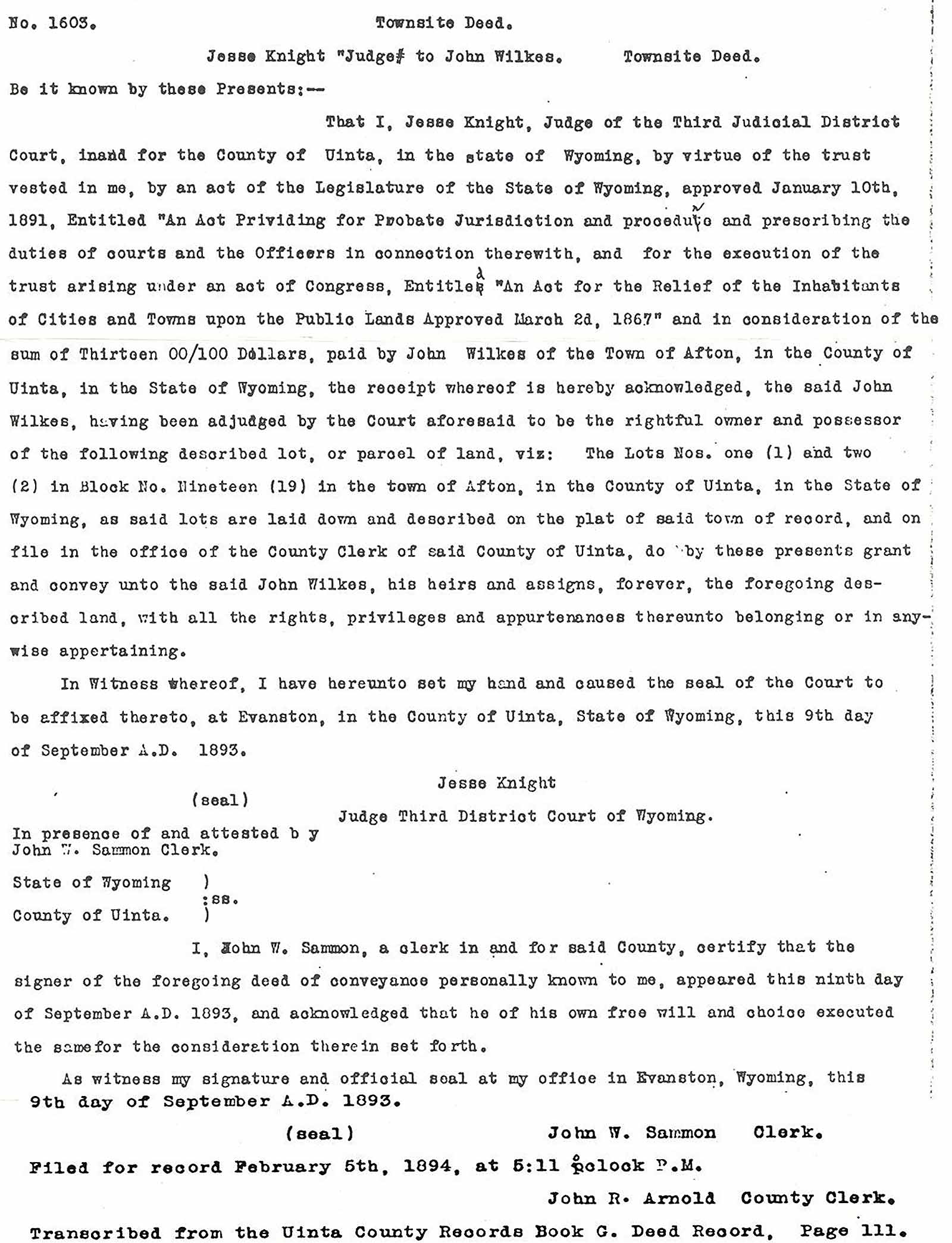 Note the date of the deed - 9th day of September A.D. 1893. It was registered and filed on the 5th day of February 1894, at 5:11 o'clock P.M. Somebody with some influence was in the right place at the right time. Attempting to find the reason, could it have been that the Judge of the Court was aware that John Wilkes, with two brothers-in-law, actually, were the first to settle where the town-site later came into being and spent the winter of 1879-80 in a cabin but, by the time the family returned a few years later, it had been concluded that was where the town of Afton was to be. Is it possible that it was a prearranged trade that was finalized in 1893? Quite possible and the more we ponder, the more likely such could have been.