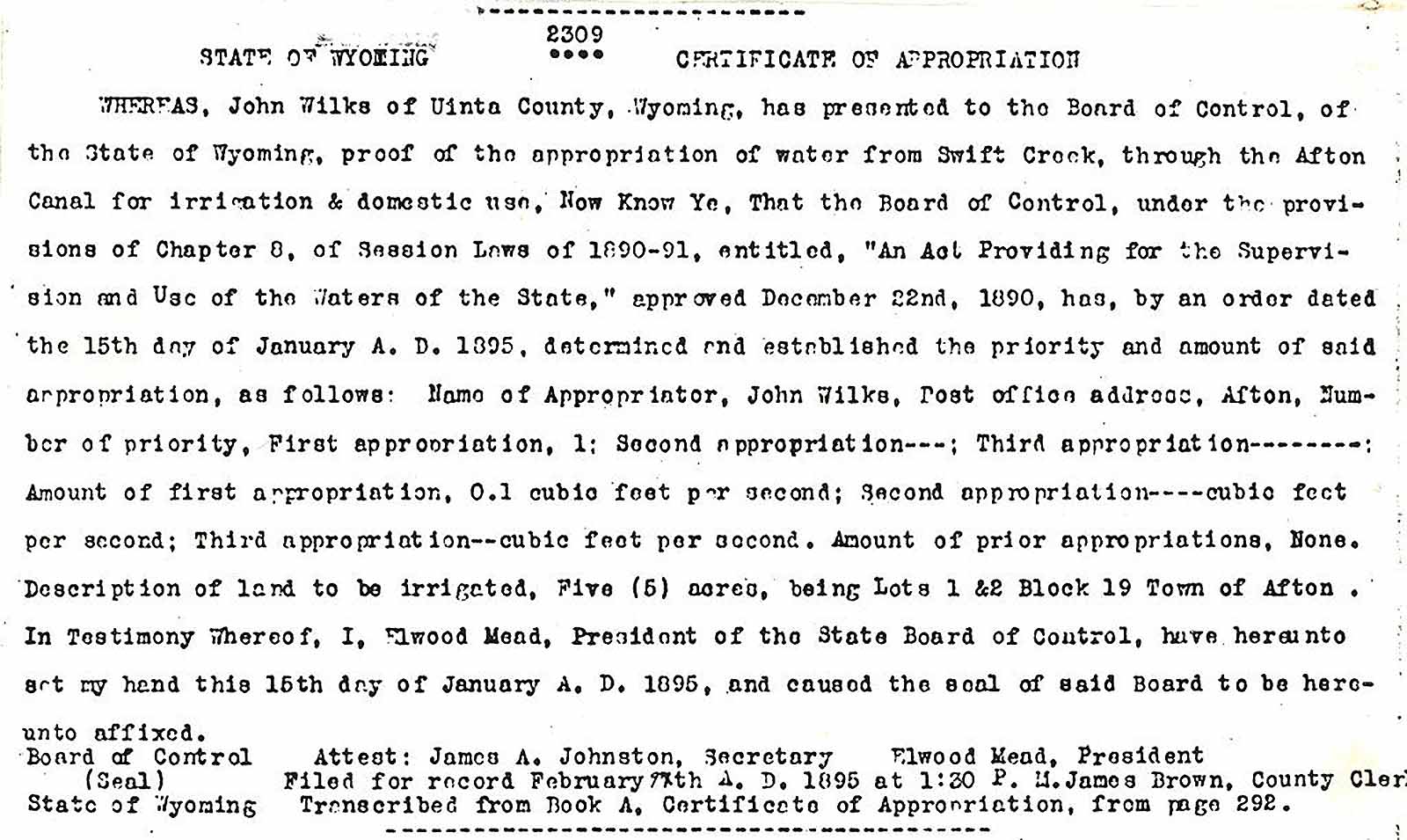 After obtaining the deed to lots 1 and 2 in Block 19 in Afton - the Wilkes family yet on their 160 acres homestead west of Afton - it became logical that steps should be taken to obtain water rights for the five acres in town and so, application was made. Note the legal Certificate of Appropriation issued by the State Board of Water Control dated 15th day of January 1895.