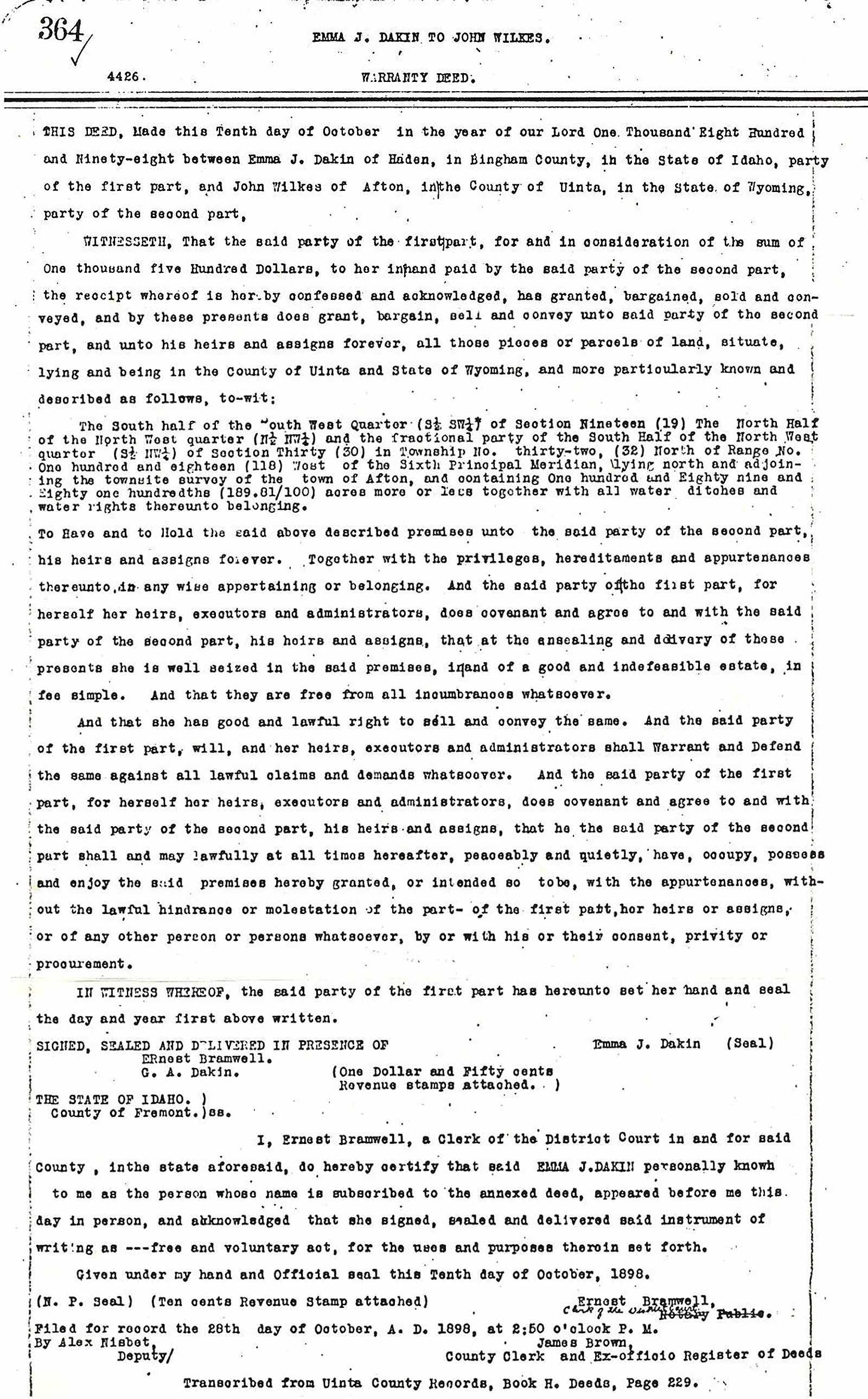 As will be noted from the following deed, John Wilkes purchased and paid in full for this over 189 acres from one, Emma J. Dakin, a farm which joined the town-site of Afton to the north and immediately adjacent to the Swift Creek.