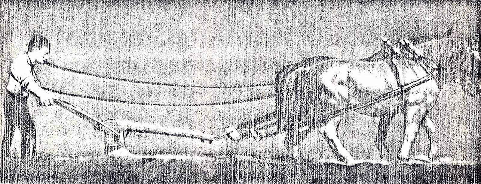 If the plot of ground was not overly rocky the next step to prepare the seed-bed was to use a leveler - a home-made gadget built with heavy 2 x 8 or 2 x 10 inch plank on edge with perhaps three or four coarse pieces which would scrape the high places down and fill the low places. This made it much easier for directing the water at irrigating time.