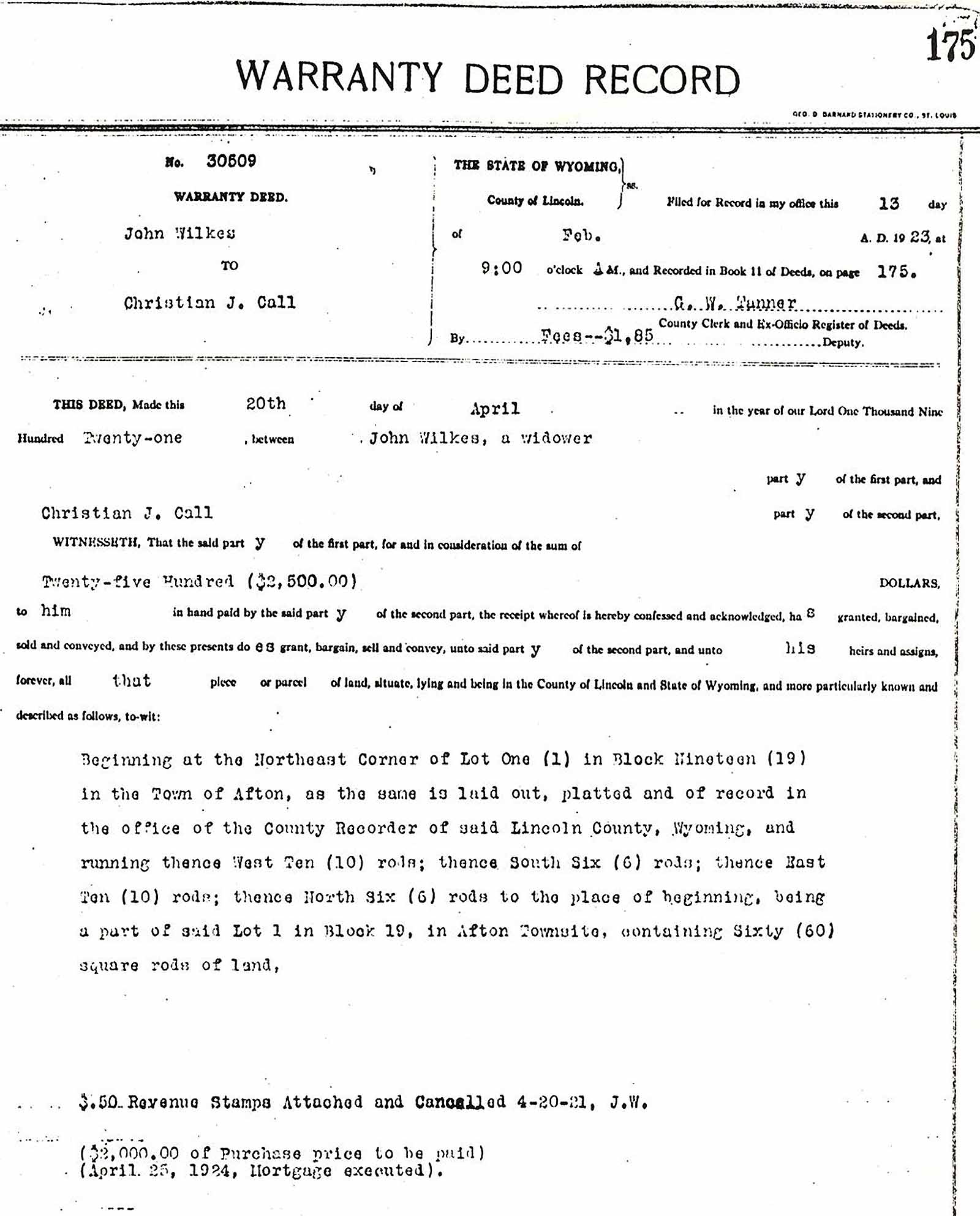 It becomes a known fact from documents, copies of which we obtained from the Lincoln County Court House in June of 1984, that John Wilkes had served a the legal administrator of Martha Wilkes' estate which was the house and lot in Afton. Also, evidence revealed that the home was sold to Christian J. Call on the 20th day of April 1921. For many years a service station stood on that piece of property, however, of late years, the Afton City offices occupy the spot.