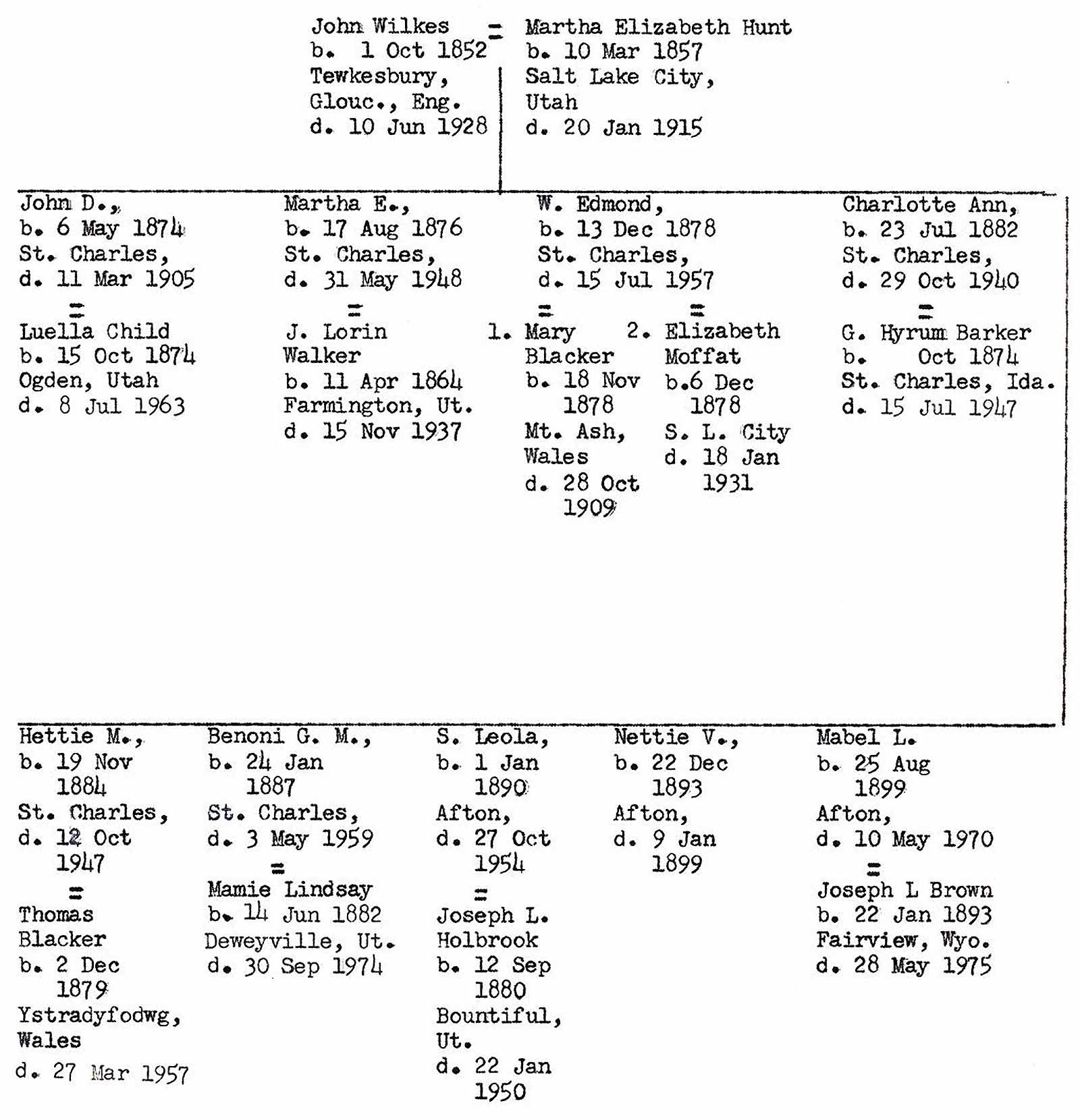 Commencing with the next chapter, an attempt will be made to briefly review the lives of each of the children, in order of birth, of Grandpa and Grandma. Each of these accounts will be brief. In some cases, just as their brief history was written by them personally or by one of their children. In the first place the plan was to write of the Wilkes family ancestry only, including Grandpa and Grandma. This much has been concluded with this chapter. Hopefully, each of us has learned a little of our forebearers and, to have become sufficiently informed of their individual lives that we can more fully appreciate the part each of them played in our lives to make us who we are.