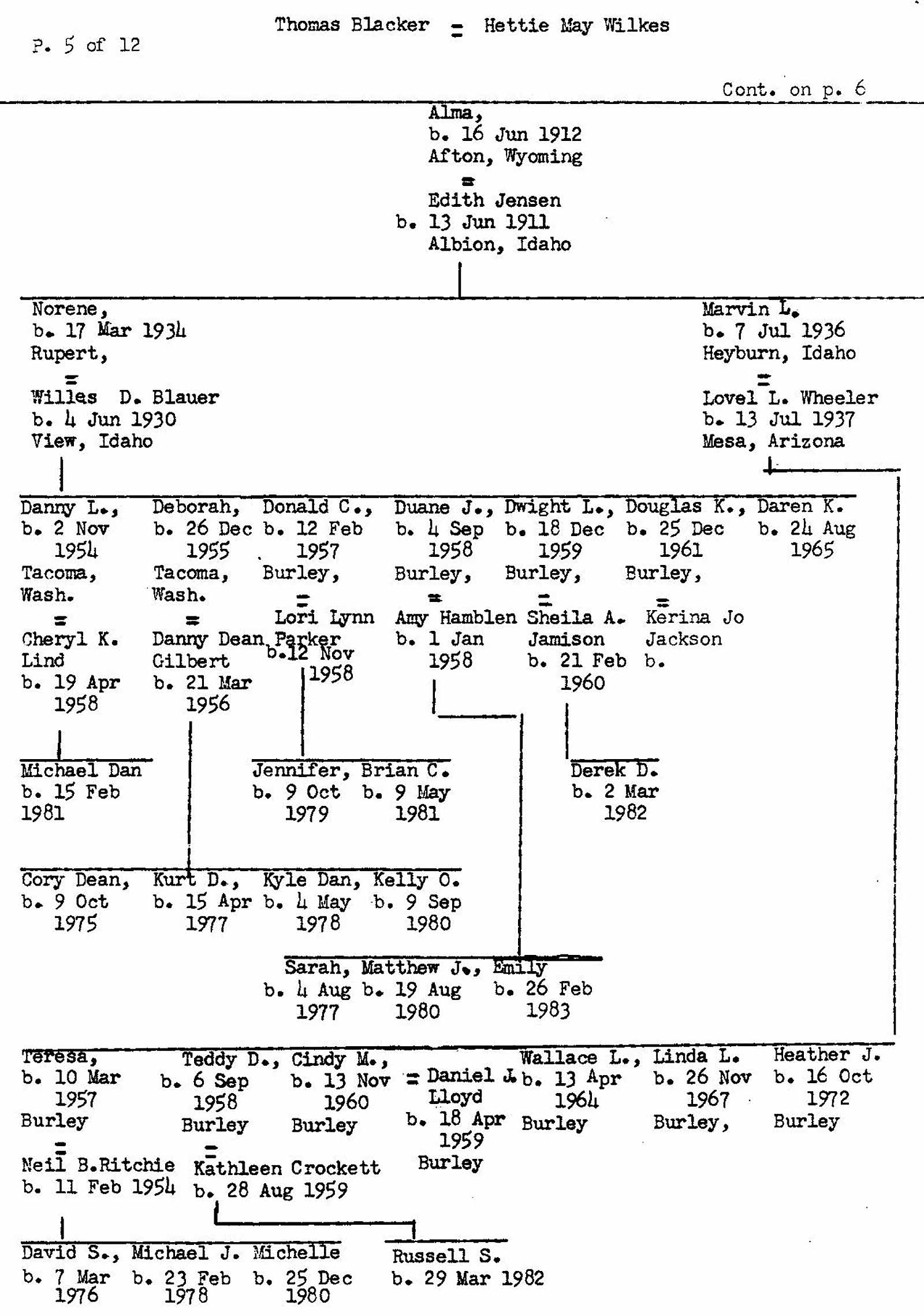 As with other families, the Thomas and Hettie Wilkes Blacker story is far too long to be fully reviewed in this account. Seven of us living children made the move with our parents to Idaho, and four additional ones, Merintha, on the 8th of December 1920, twin boys, Earl and Verl, arrived on the 17th of July 1923, and lastly, baby Marie on the 17th of September 1925.