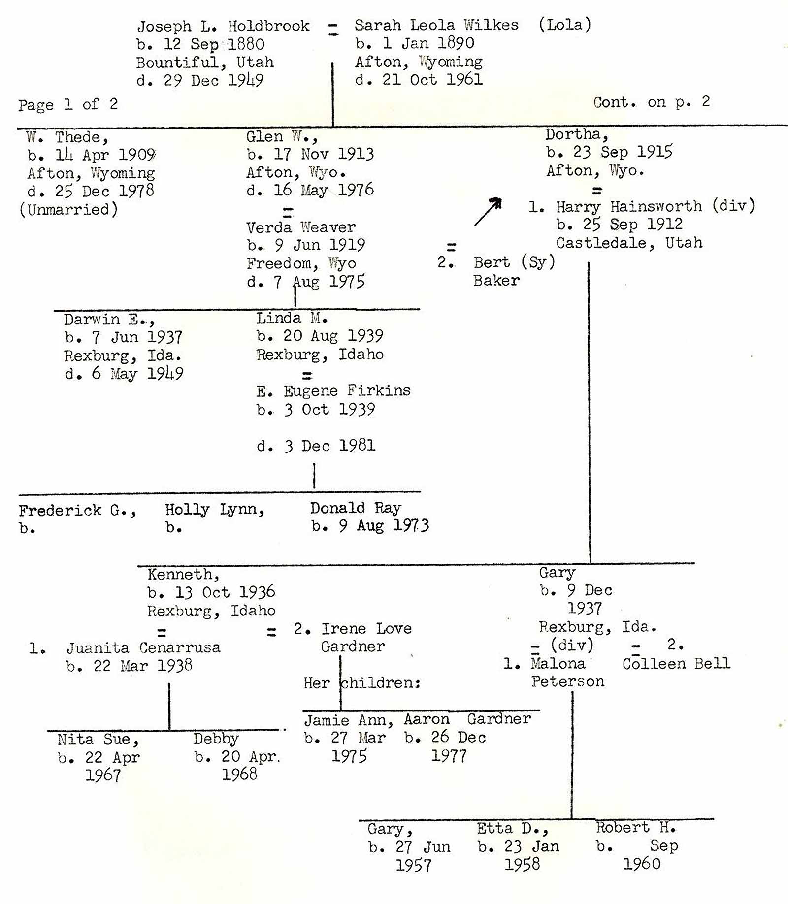 Dortha Holbrook: "I was born in Afton, Wyo., September 23, 1915. Baptized by Adolf Jensen, 3rd Nov. 1923. Confirmed by Charles Moser, 4th Nov. 1923. In 1926 we moved to Marysville, Idaho. In 1935 I married Harry Hainsworth and to our union two children were born, Kenneth and Gary Hainsworth.