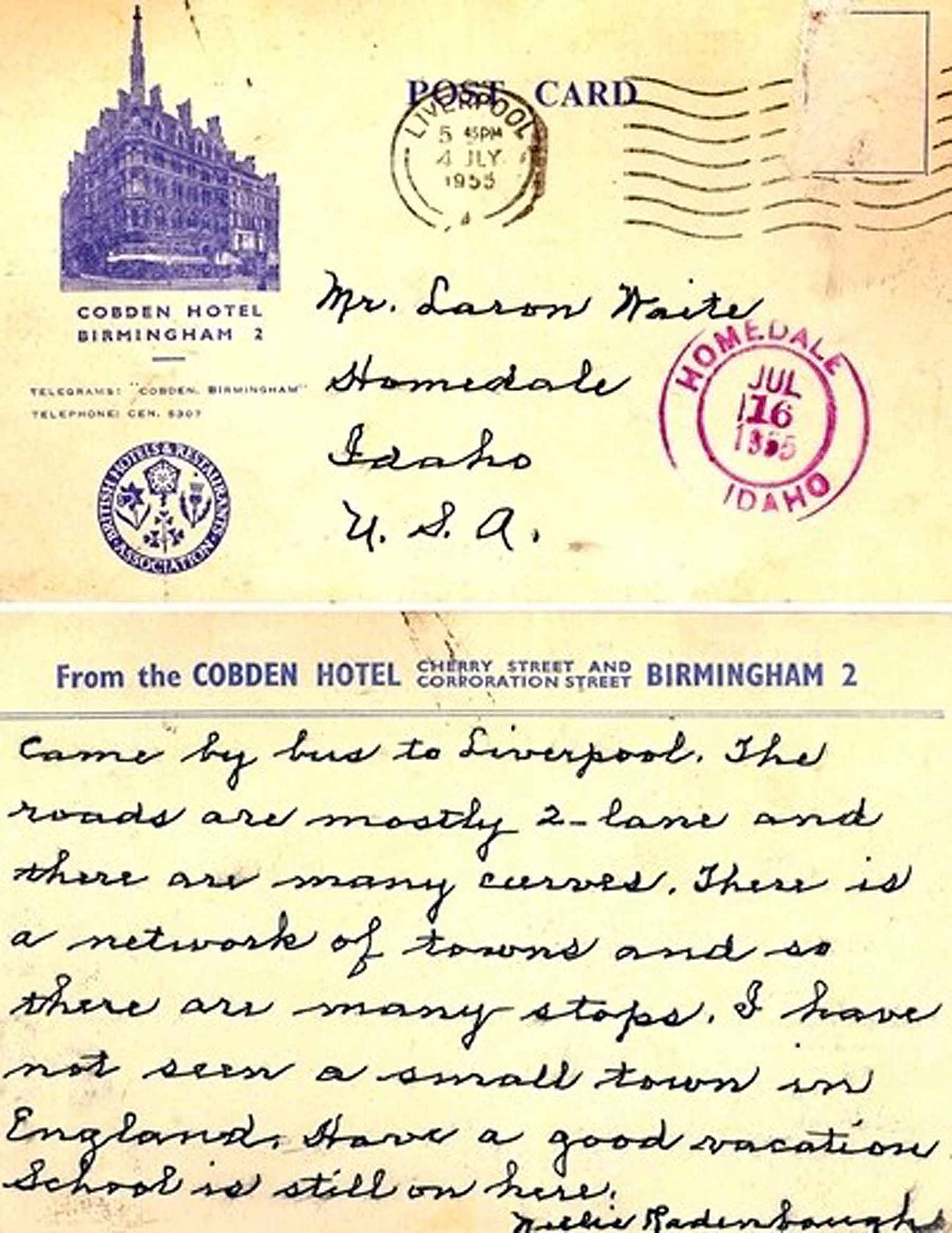 Nellie Radenbaugh was one of my favorite teachers in high school. She taught language arts. In my very small school that meant she could teach anything from English to History to Economics. I liked her because of her wit and ability to tell stories. She was very old and was probably past retirement age. She and a friend toured England during the summer of 1955 and sent this postcard to me.