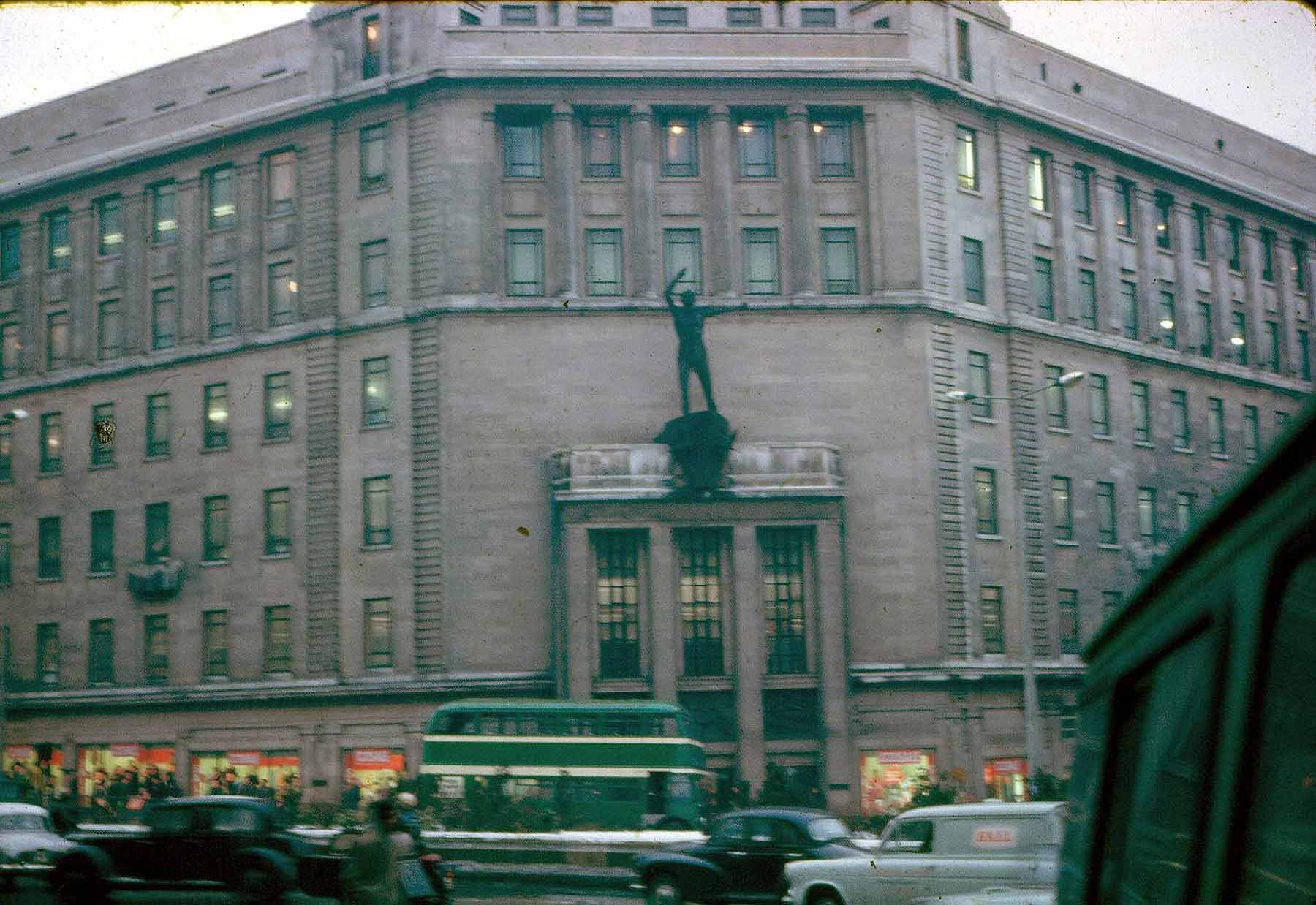 BOAC lodged us in a hotel and we spent Wednesday the 14th seeing some of New York. We finally left for London at 1:00 am on the 15th. We couldn't land in London because of bad weather so we continued on to Manchester. However the weather in Manchester was bad so we landed at Prestwick airport near Glasgow, Scotland. In Prestwick we waited until the weather in Manchester cleared and then flew back to Manchester in an old, somewhat shabby, very small, propeller driven plane. Because of the weather we had to fly very low so I saw Scotland and Northern England from just above the tree tops, well maybe a little higher.