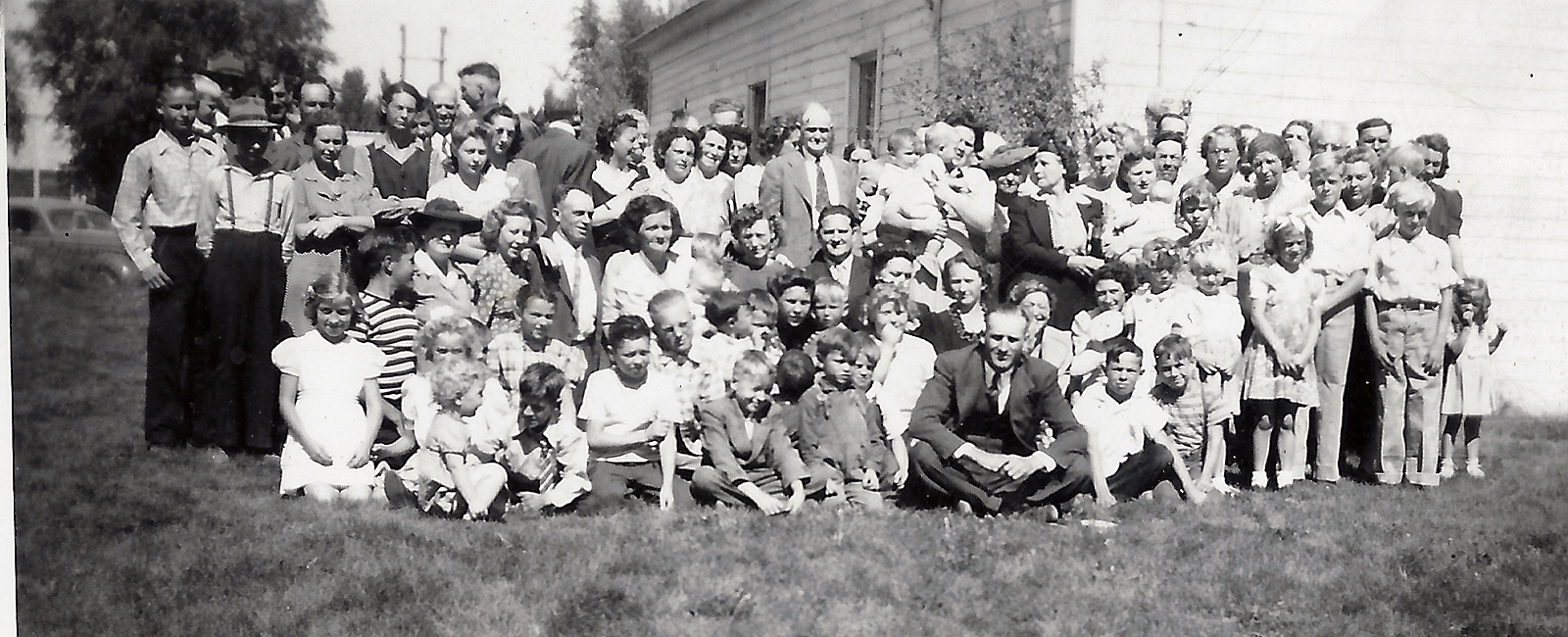 Members of the Homedale Ward in front of the white church building