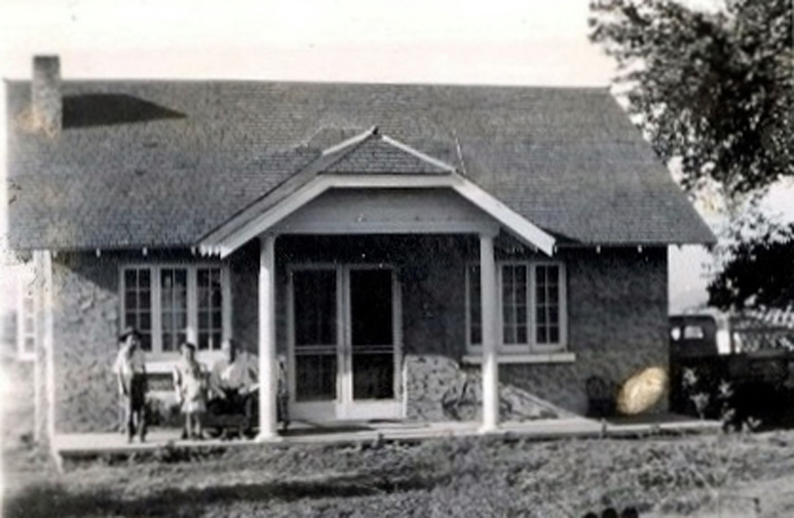 The house had a kitchen, front room, large bedroom and a large screened in porch all across the front. No bathroom or inside plumbing. We did have a good well with cold, real good tasting water. There was a large front yard, with several lovely trees and a lot of different flowers growing everywhere. All this yard was fenced, so we could keep the boys off the main road that ran along the east front. There was also a small smoke house, underground cellar, granary and a garage in the barnyard.
