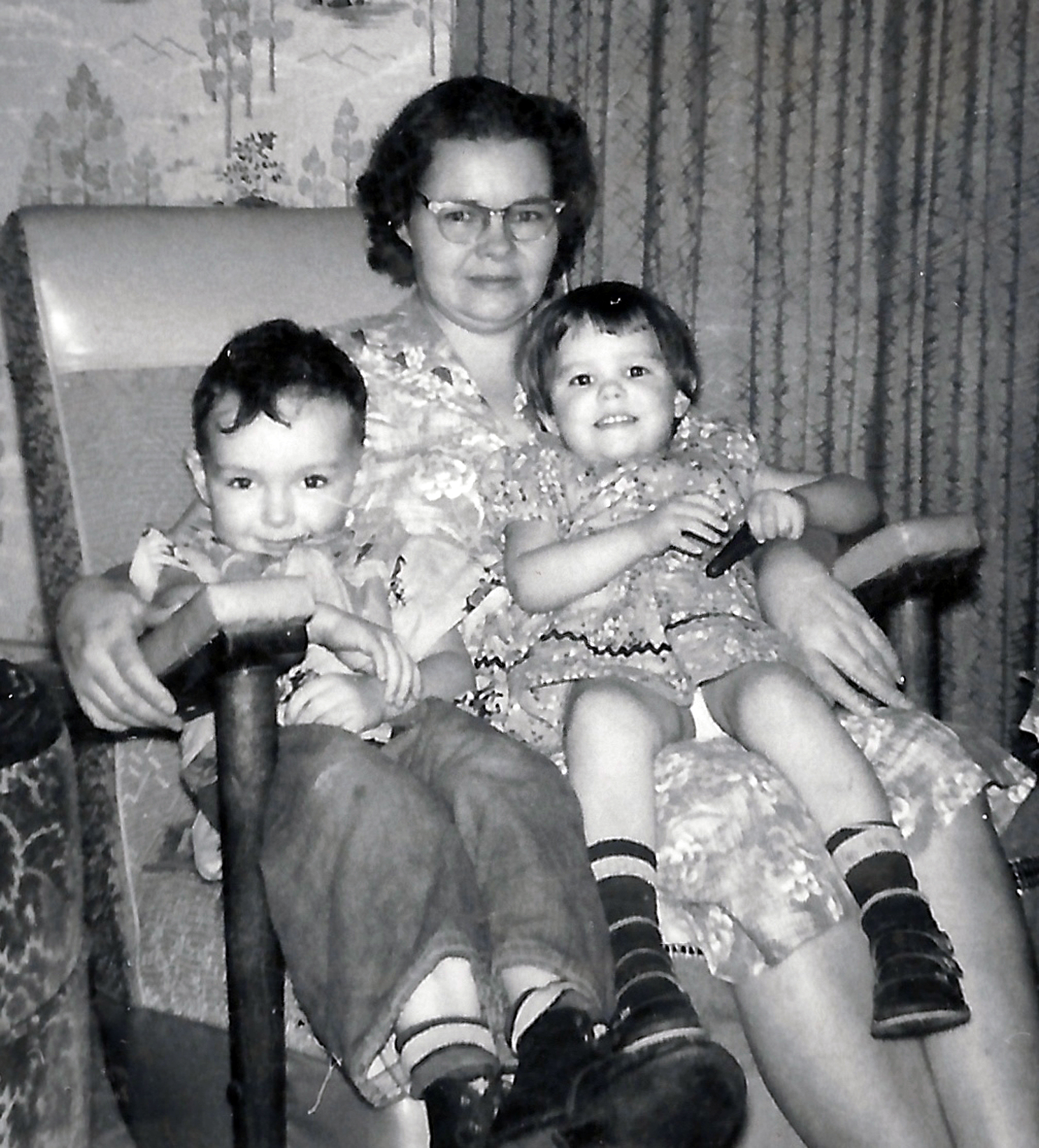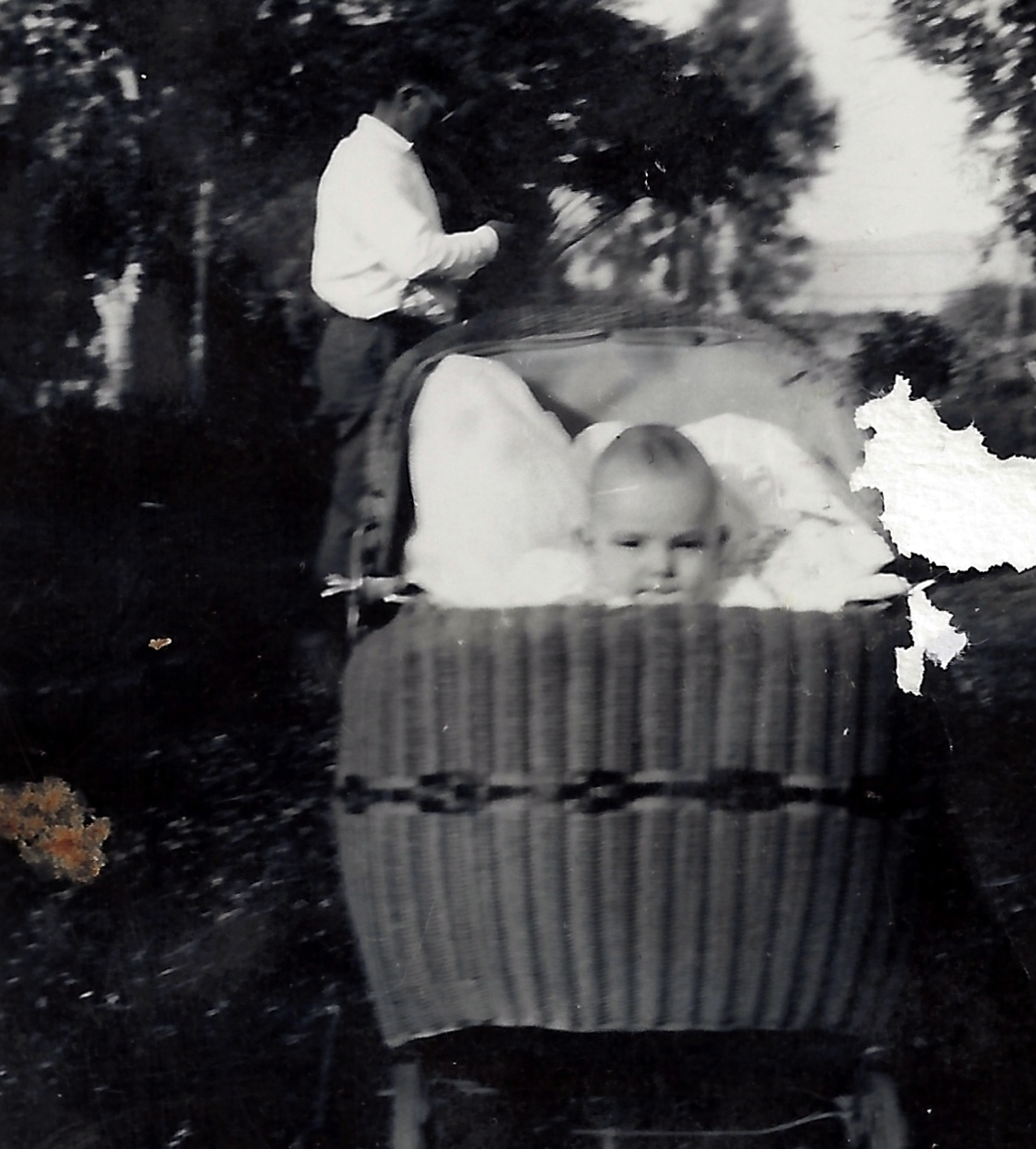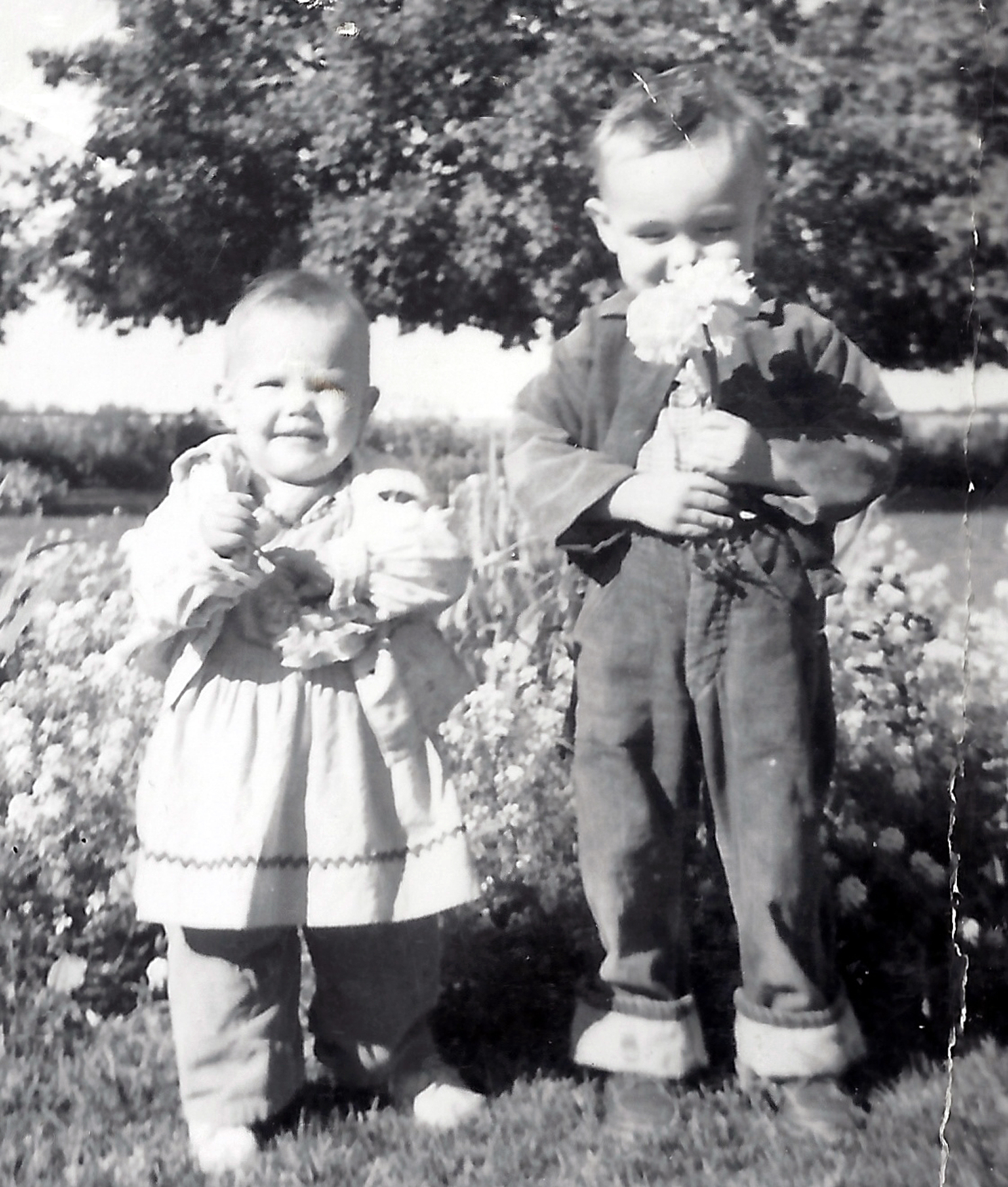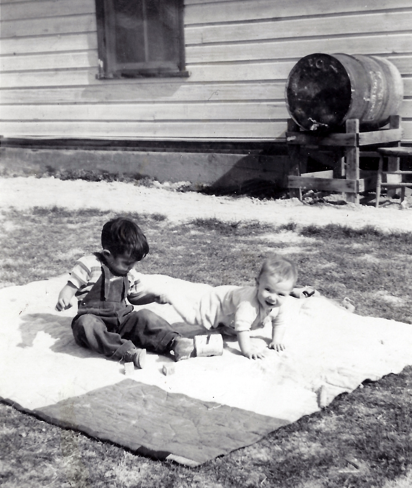When we first moved into the basement house, Rick was a real little guy and slept in a crib. But he learned how to throw his little leg up over the top and climb out. When it was time to go to bed at night, if he didn't want to go, he would climb out faster then we could put him in. Dad said he guessed we would have to tie him in. We decided the best way was to tie a wide band of cloth around his little ankle so he couldn't raise his leg up over the side of the crib. That is what we did and oh was he ever upset. He would cry and try to get his leg up, but finally he resigned himself to it, so when we took him into bed and lay him down, he would raise up his little foot for us to tie. Both Dad and I felt mean to do it.