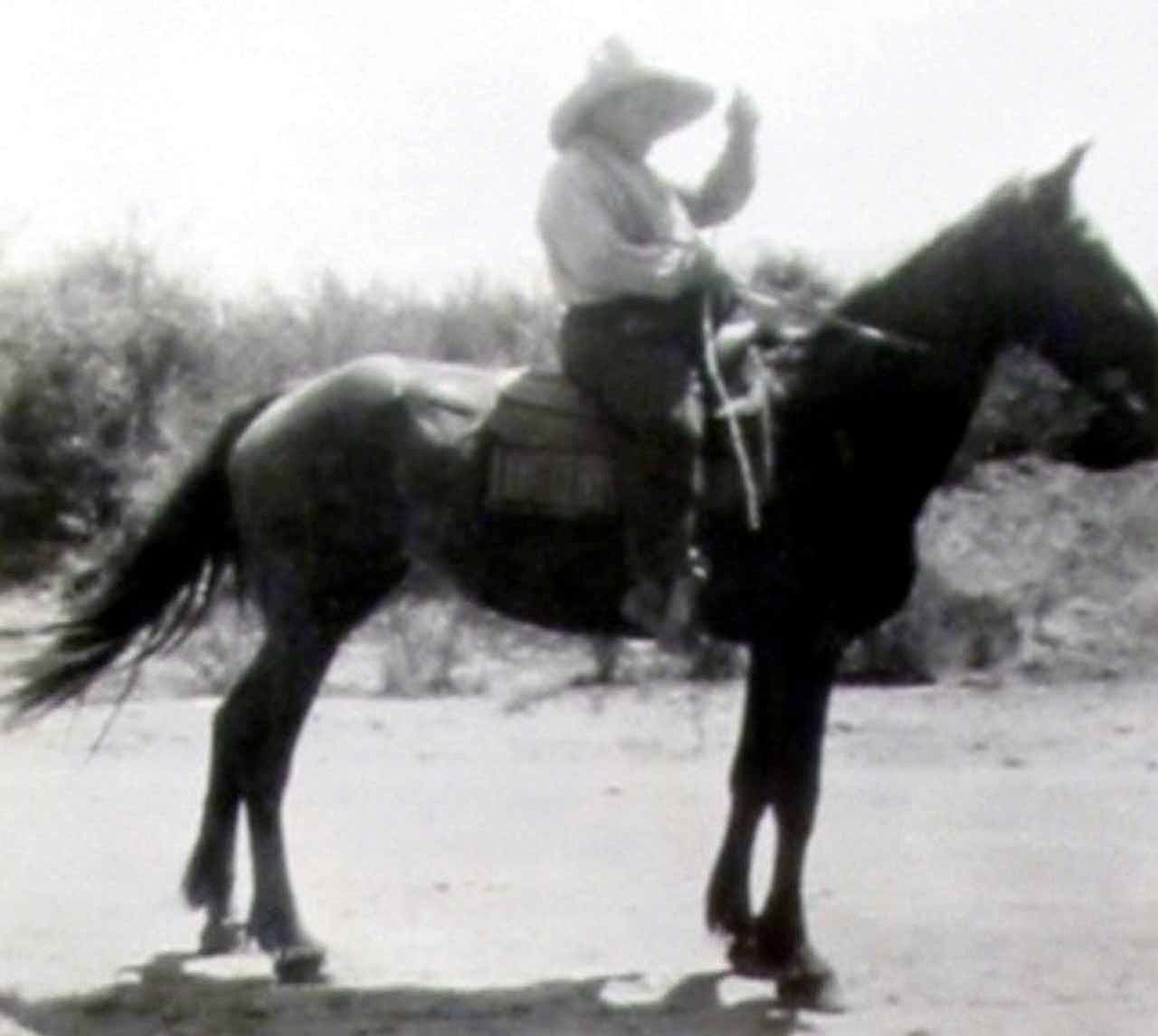 There was a mean old stallion that ruled the herd that we called "Old Hubbard". He was a big brown horse and mean as all get out. He was absolutely mean and was out to kill. He would come right for you with his ears back and his teeth bared whether you were horseback or on foot. He would rear up on his hind legs and paw with his front feet, ready to kill anything he could get close enough to.