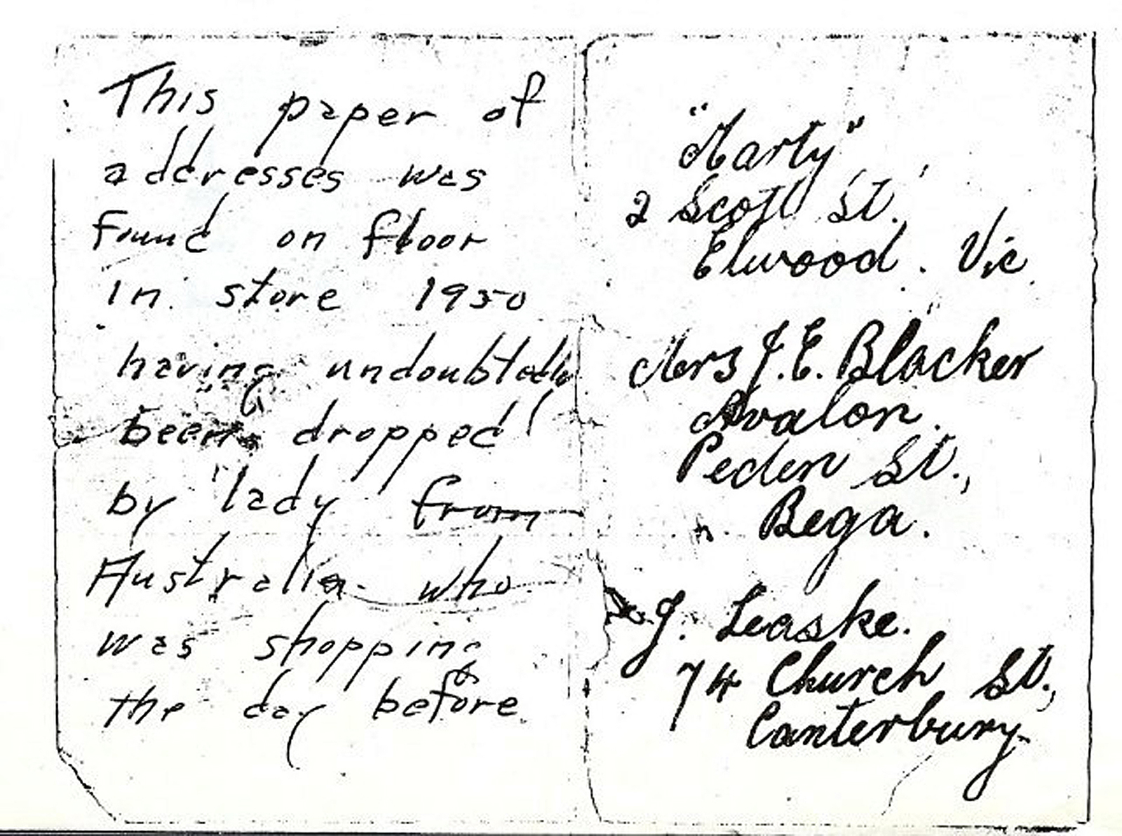 "Some people may say that it was just coincidental that the girl came into the store but I ask, why of all the places between Australia and her intended destination did she have to lose that little paper in Ontario? Why did she go into an appliance store for hand lotion? When the piece of paper fluttered to the floor, which it must have done, why didn't either she or me notice it fall? Had we noticed it I would have picked it up and returned it to her. Why was the little piece of paper so stubborn to move along the floor when I was cleaning the floor? Had it gone along like most of the other clutter I would have swept it onto a dust pan and thrown it into the waste paper basket.